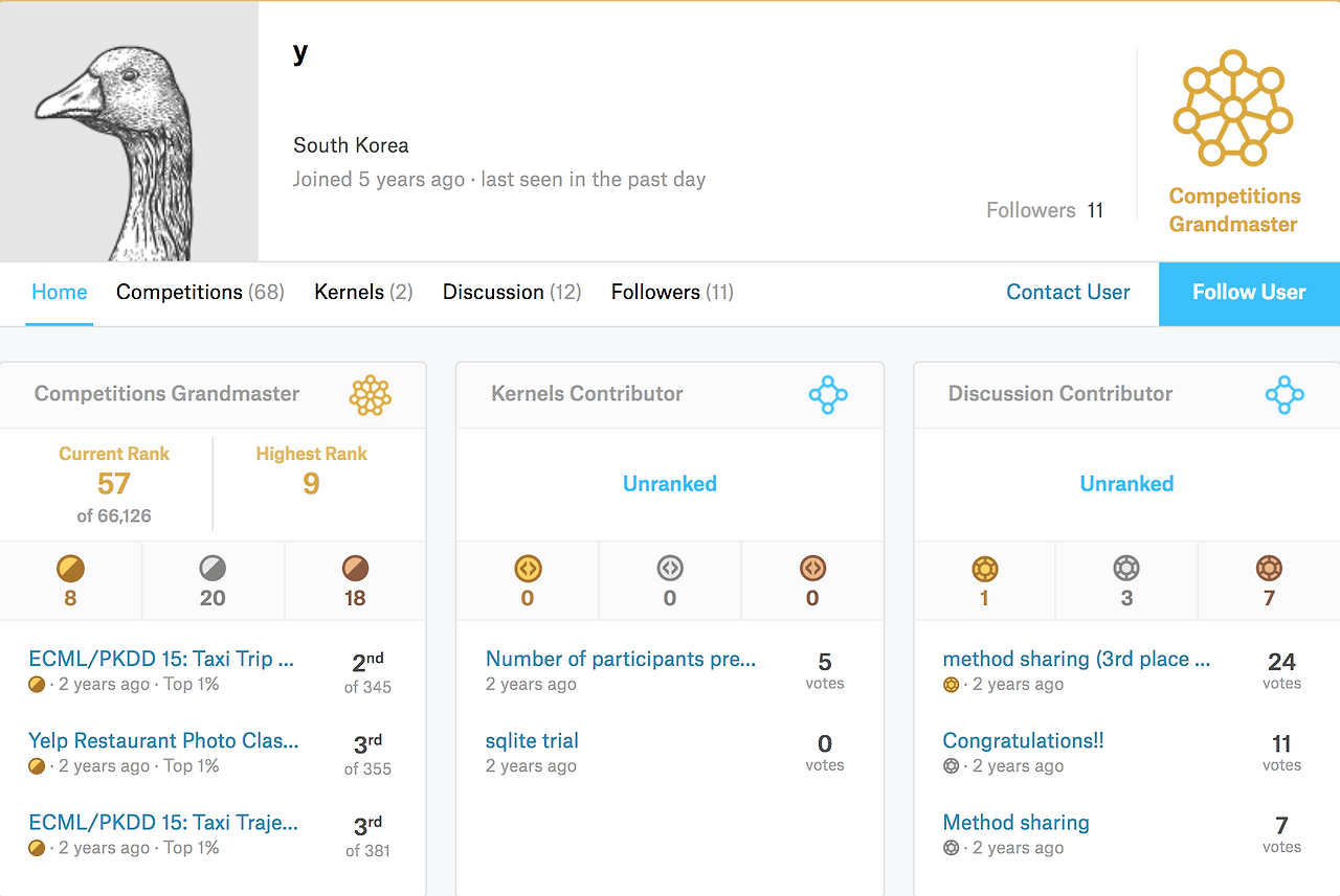 현재 캐글 전체 순위 57위이시고 데이터 사이언스 관계자분들께서는 정말 유명한 분이시라고 하네요! ㅋㅋ