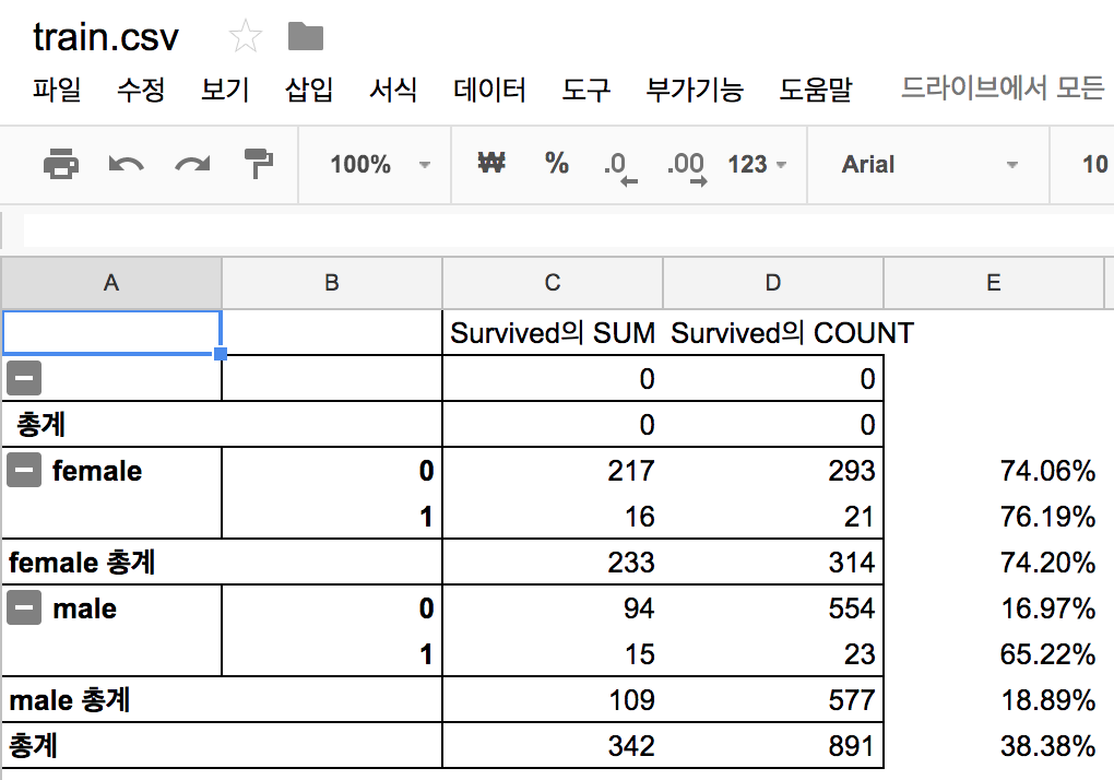 엑셀 혹은 구글 스프레드시트를 통해서 타이타닉 사건의 생존율을 구할 수 있습니다!