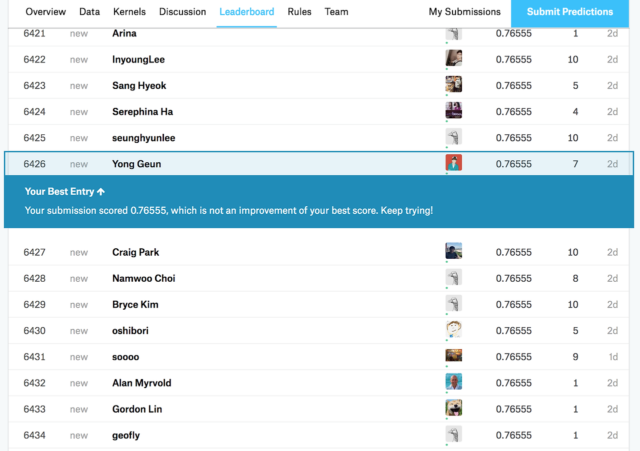 다만 캐글을 해본 결과 꾸준히 지속적으로 계속 도전을 해야 할 것 같습니다!