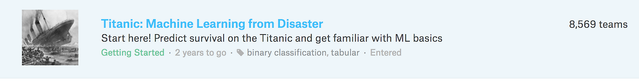 처음 입문 시에 많은 분들이 타이타닉 프로젝트로 시작한다고 합니다! (옆에 총 8569팀이 참여한 겁니다!)