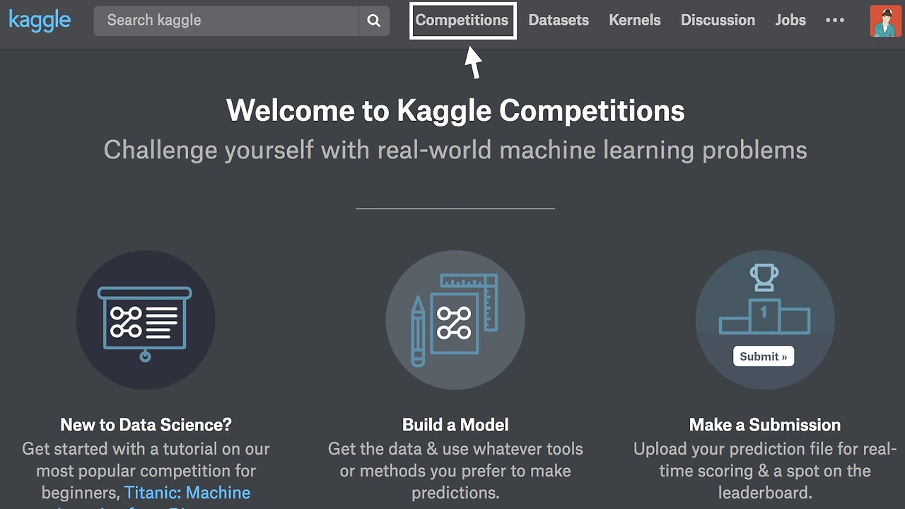 상단 카테고리에서 Competitions 탭을 클릭을 해주세요!