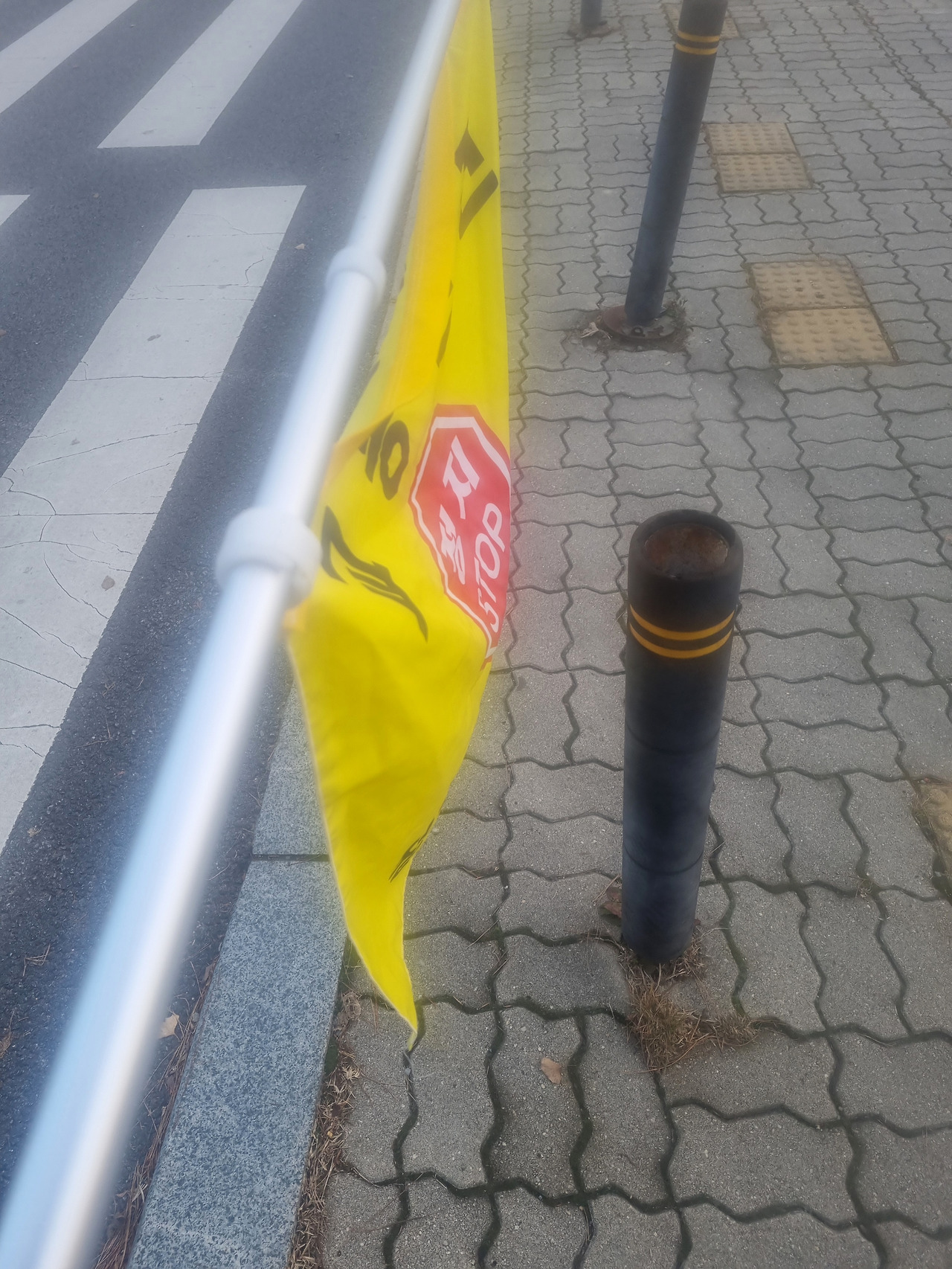 교통안전 깃발을 들고 지정된 위치에 서 보니 신호등 없는 횡단보도가 눈에 들어왔다. 두 개의 횡단보도가 연달아 연결된 구조였는데 하나는 노인회 분들이 책임지고 다른 하나는 학부모들이 책임지는 방식이었다. 짧은 횡단보도라 신호등이 없고 등교 시간에는 차량이 끊임없이 다녔다.