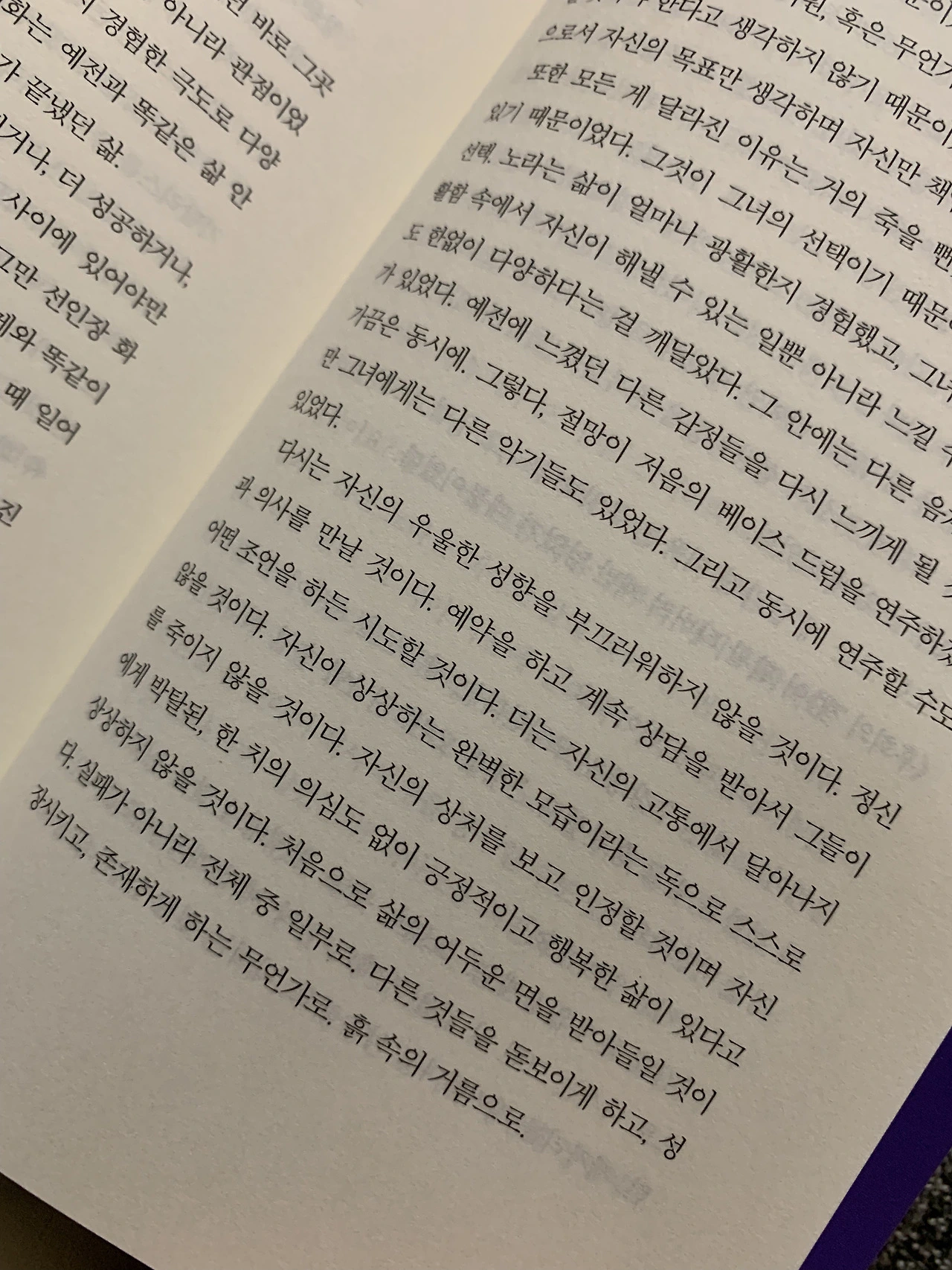 "살다보면 더 쉬운 길이 있을 거라고 생각하기 십상이죠...하지만 아마 쉬운 길은 없을 거예요. 그냥 여러 길이 있을 뿐이죠. 전 결혼한 삶을 살았을 수 있어요. 가게에서 일하는 삶을 살았을 수도 있고요. 함께 커피를 마시자는 귀여운 남자의 제안을 수락했을 수도 있죠. 북극권의 한계선에서 빙하를 연구하면서 살았을 수도 있고, 올림픽 수영 메달리스트가 됐을 수도 있어요. 누가 알겠어요? 매일 매 순간 우리는 새로운 우주로 들어가요. 자신을 타인 그리고 또 다른 자신과 비교하며 삶이 달라지기를 바라는 데 많은 시간을 보내죠. 사실 대부분의 삶에는 좋은 일과 나쁜 일이 공존하는데 말이에요.-매트 헤이그 [미드나잇 라이브러리] 중에서"
