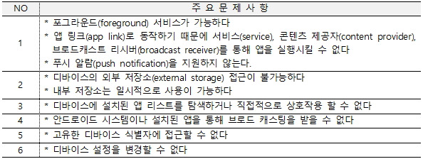 앱(App)에서도 웹(Web)과 융합하려는 움직임이 일어나고 있다. 구글이 2016년 5월 개발자 컨퍼런스인 ‘Google I/O 2016’에서 ‘인스턴트 앱(Instant App)’을 발표하면서 웹과 앱의 경계를 허물기 시작한 것이다. 사용자가 별도로 앱을 설치하지 않아도 앱이 마치 설치되어 있는 것처럼 웹에서 바로 사용할 수 있는 기술이다. ‘딥 링크(Deep Link)’ 기능의 많은 부분들이 보완되긴 했지만, 그래도 ‘네이티브 앱(Native App)’의 기능을 온전하게 제공하는 데에는 한계가 있다. <표 1>에서 보이는 여러 문제점들을 극복하기 위해서 구글은 올해 2월에 ‘프로그레시브 웹앱(PWA, Progressive Web App)’을 발표하였다. 현재는 크롬(Chrome) 베타 버전의 웹사이트에서만 홈스크린에 웹앱을 추가시켜 이용할 수 있지만 향후에는 모든 안드로이드용 브라우저에서 PWA을 지원할 계획이라고 한다. 구글은 ‘인스턴트 앱 프로젝트’와 ‘PWA 프로젝트’를 통해서 사용자에게 다양한 디바이스에서도 편리한 사용경험을 제공하고자 노력하고 있다.