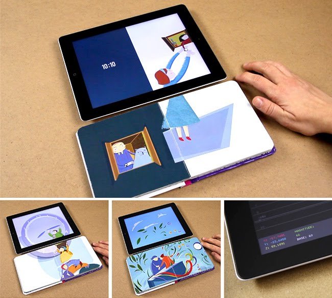 포르투갈 미뉴대학의 Engage Lab에서 개발한 '브리징북(Bridging book)'은 종이책과 전자책의 경계를 무너트린 어린이 동화책이다. 종이책 페이지마다 자석이 내장되어 있는데 태블릿에서는 나침반 센서가 자기장의 강도를 감지해서 종이책과 동기화 시켜주는 구조이다. 어린이가 종이책 페이지를 넘기면 태블릿에서는 자동으로 해당 페이지의 일러스트레이터를 보여주며, 다양한 인터랙션을 지원하기도 한다. 아이들은 자연스럽게 종이책과 전자책을 함께 경험하면서 책에 대한 관심과 흥미를 높여가게 된다.
