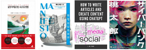 왼쪽부터 <삶의 목적을 찾는 45가지 방법>, <매니페스토>, <How to Write and Create Content Using ChatGPT>, <Cyberpunk: Momotaro>