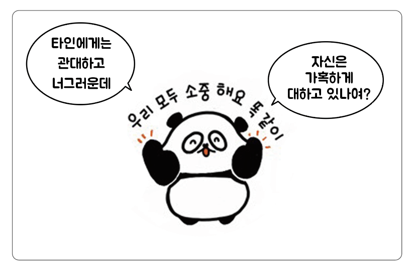 타인에게는 관대하고 가족에게는 가혹한 부모도 아마도 그런 대우를 받으며 자랐기 때문에 그럴 것입니다. 어쩌면 가족을 너무 사랑하니까 더 좋은 사람들로 만들어서 조금이라도 더 편한 인생을 살라고 스스로 대장장이를 자처하고 악역을 가족들을 연단했을 수 도 있습니다. 이미 지난 일과 지금 나의 상황은 어쩔 수 없이 받아들여야 할 현실입니다. 중요한 건 지금 여기 있는 자신입니다. 내가 나와 외부세계를 그렇게 대하고 있다면 불공평한 저울을 고쳐야 합니다. 기울어진 저울추를 끊어내야 합니다.