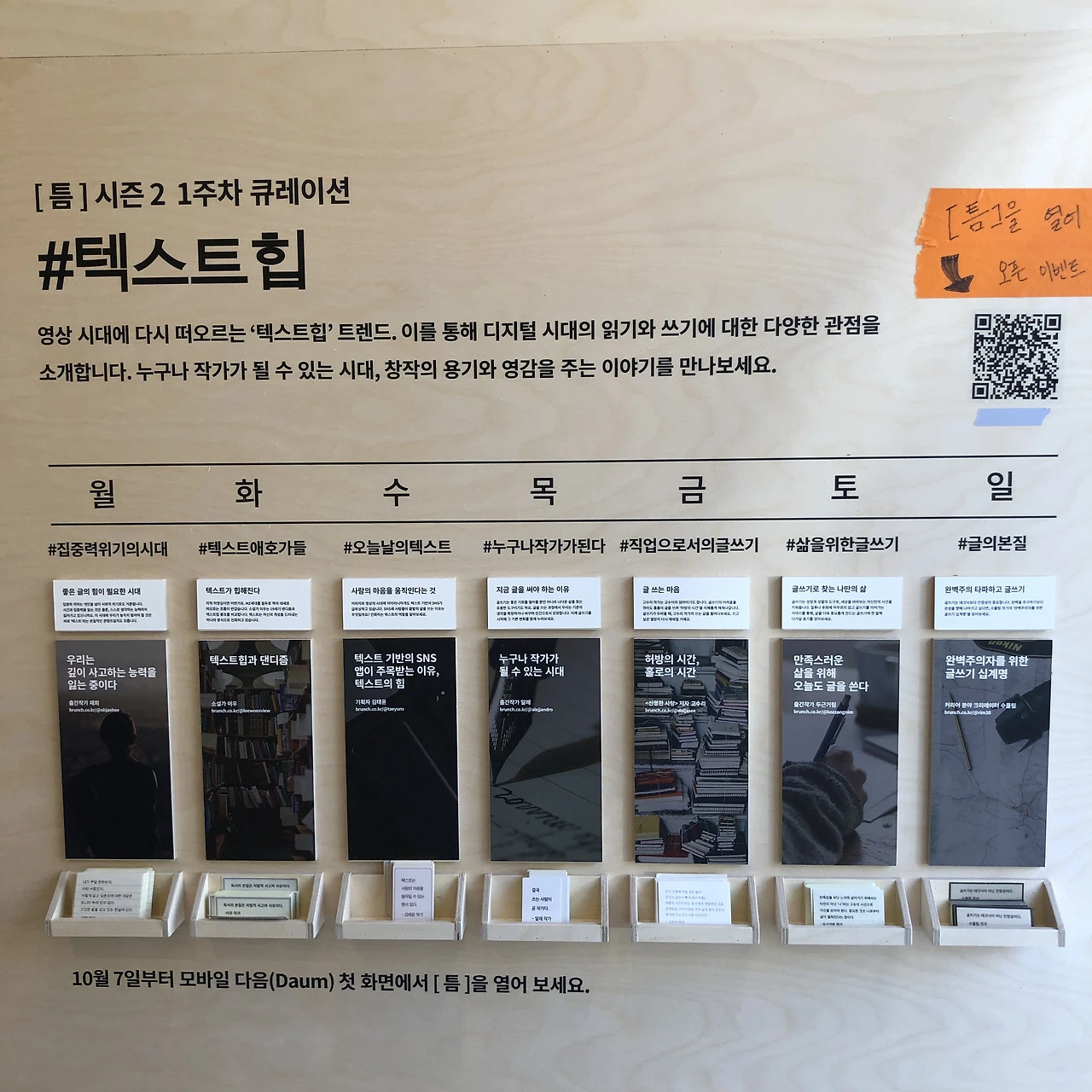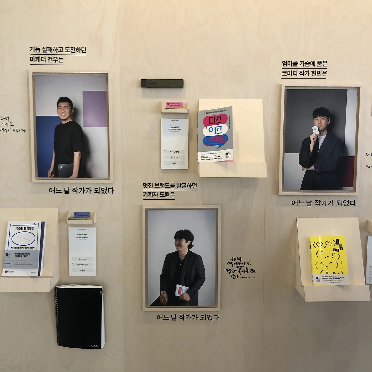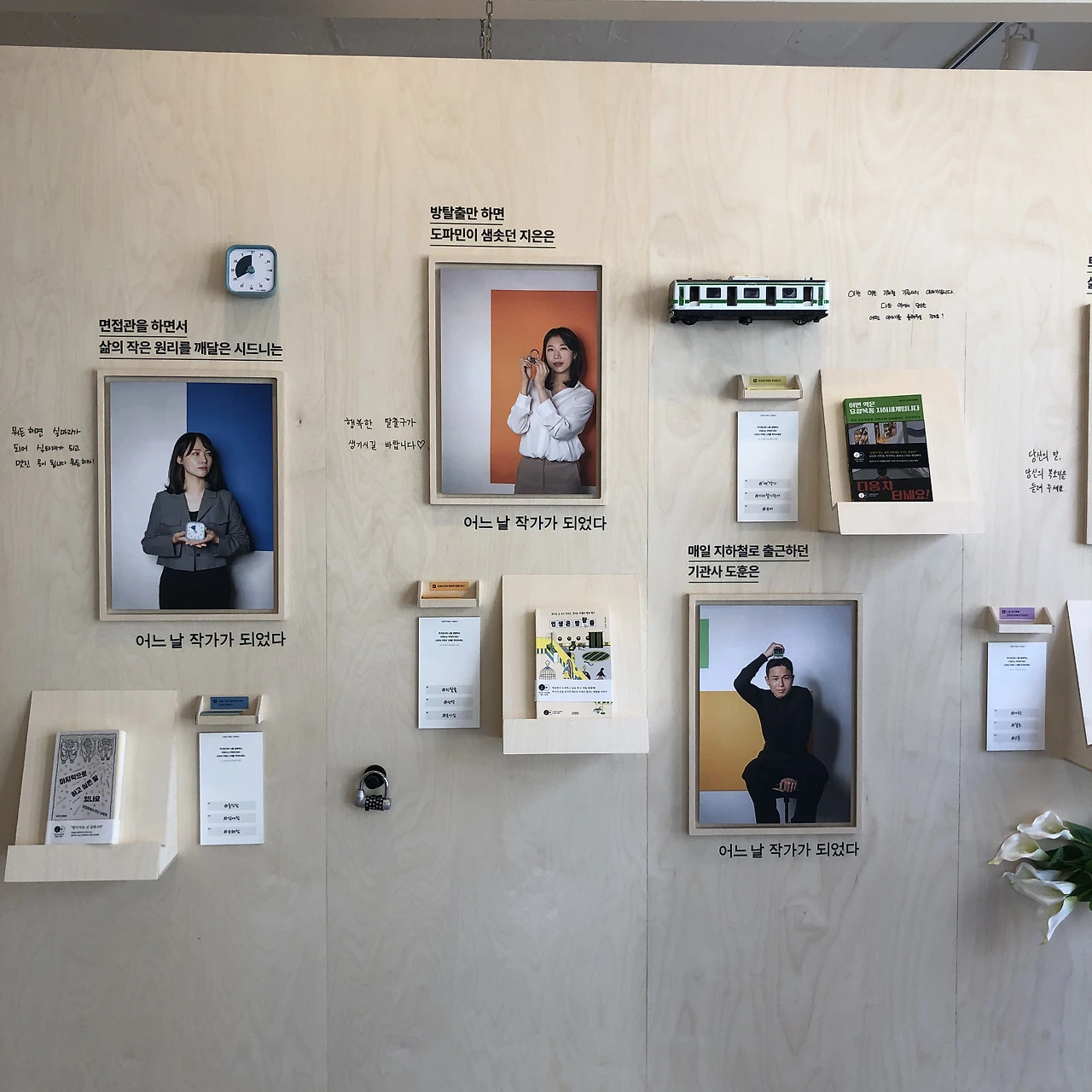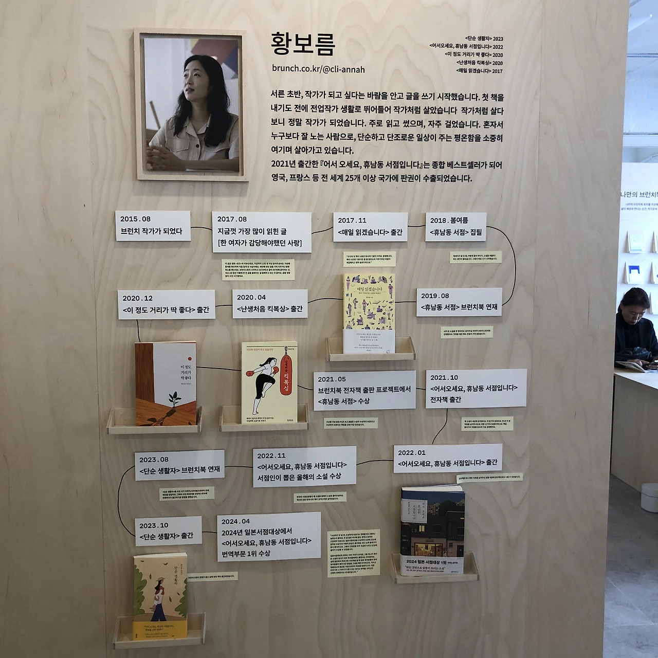 <무례한 사람에게 웃으며 대처하는 법 : 정문정 작가>, <90년생이 온다 : 임홍택 작가>, <어서 오세요, 휴남동 서점입니다 : 황보름 작가>, <그냥이 어때서 : 윤수훈 작가>, <퇴사는 여행 : 정혜윤 작가> 5인의 브런치 작가님들이 브런치스토리에 꾸준히 작가 활동을 하며 성공한 스토리가 재미있게 전시되어 있었습니다.