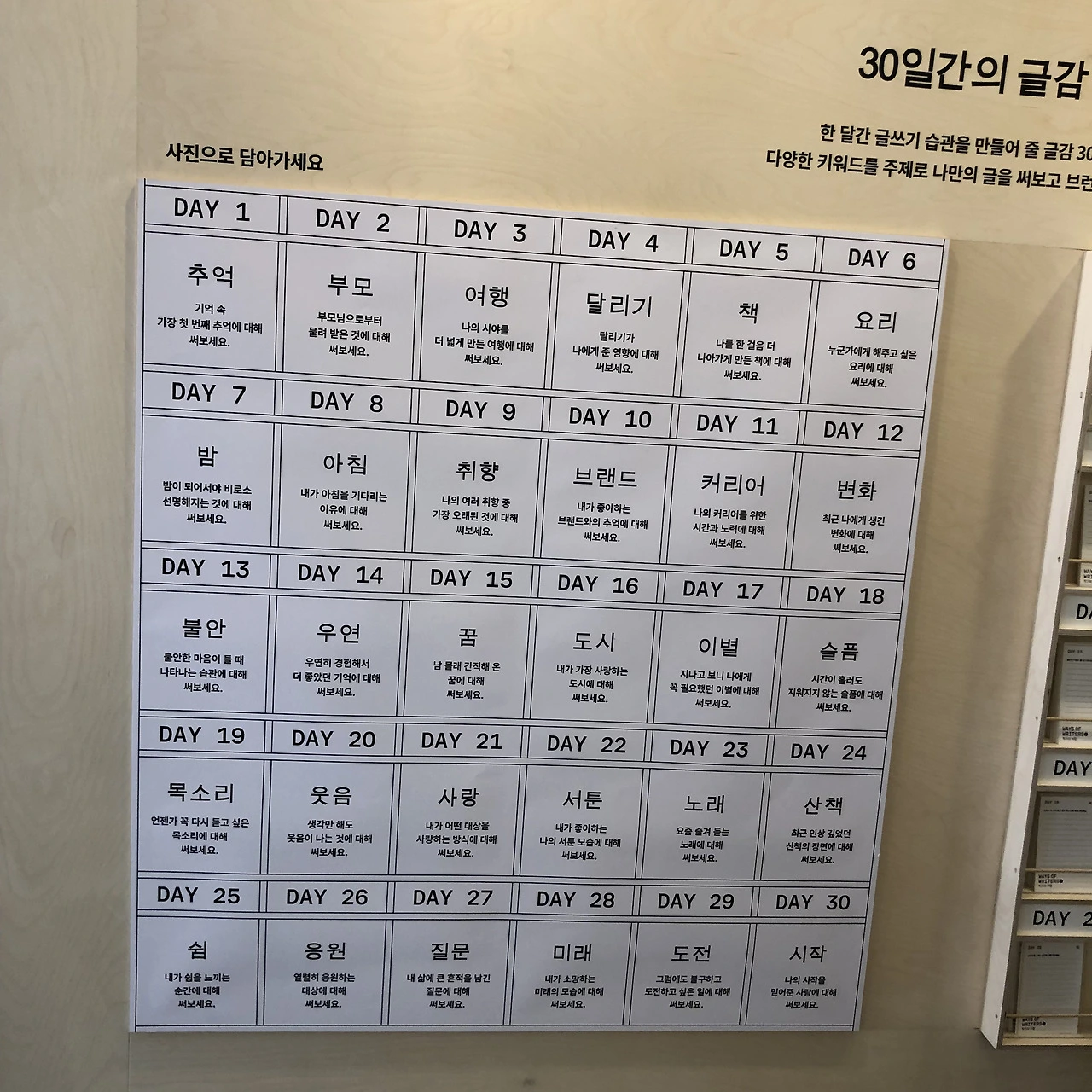 중간중간에 특별 코너들이 있었습니다. 30일 동안 글쓰기 주제를 소개하고, 글쓰기 메모장을 받을 수 있었습니다. 30개의 글감 모두 의미 있는 주제라서 30일 글쓰기 챌린지를 해보는 건 어떨까요?