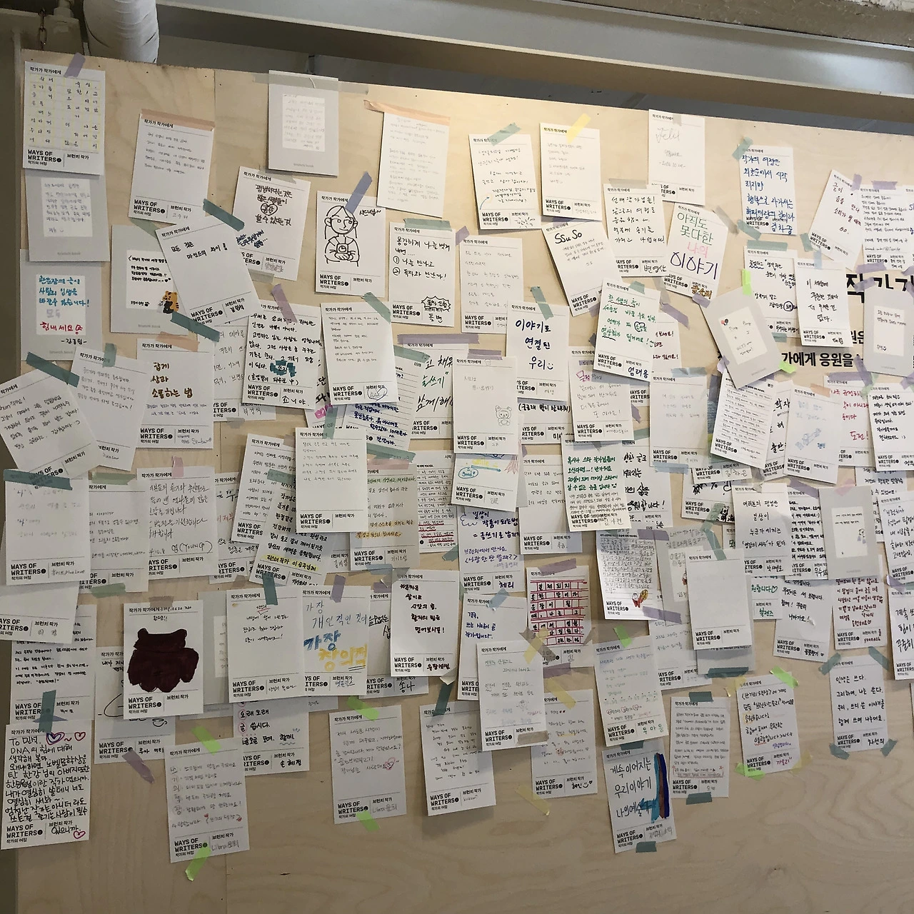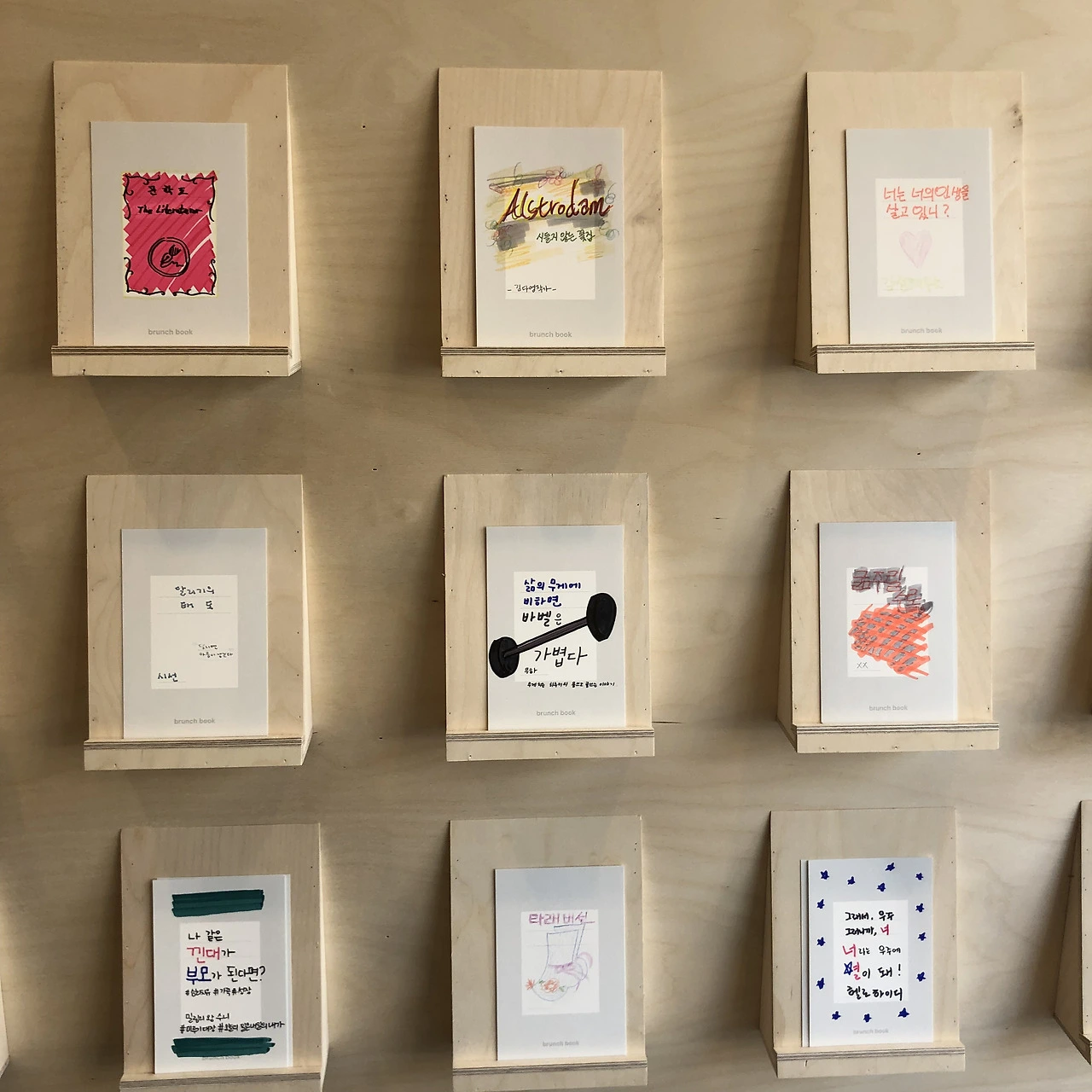<Chapter. 03 나의 글이 세상과 만난다면> 은 나만의 브런치 북을 만드는 코너였습니다. 많은 분들이 책상에 앉아서 글을 쓰고 자신만의 브런치 북을 디자인하고 있었습니다. 어떤 카페나 분식점에 가면 재밌는 메모들이 적혀있는 포스트잇이 붙여있잖아요? 웃기면서도 영감을 주는 메모와 제목, 표지들이 많아서 좋았습니다.