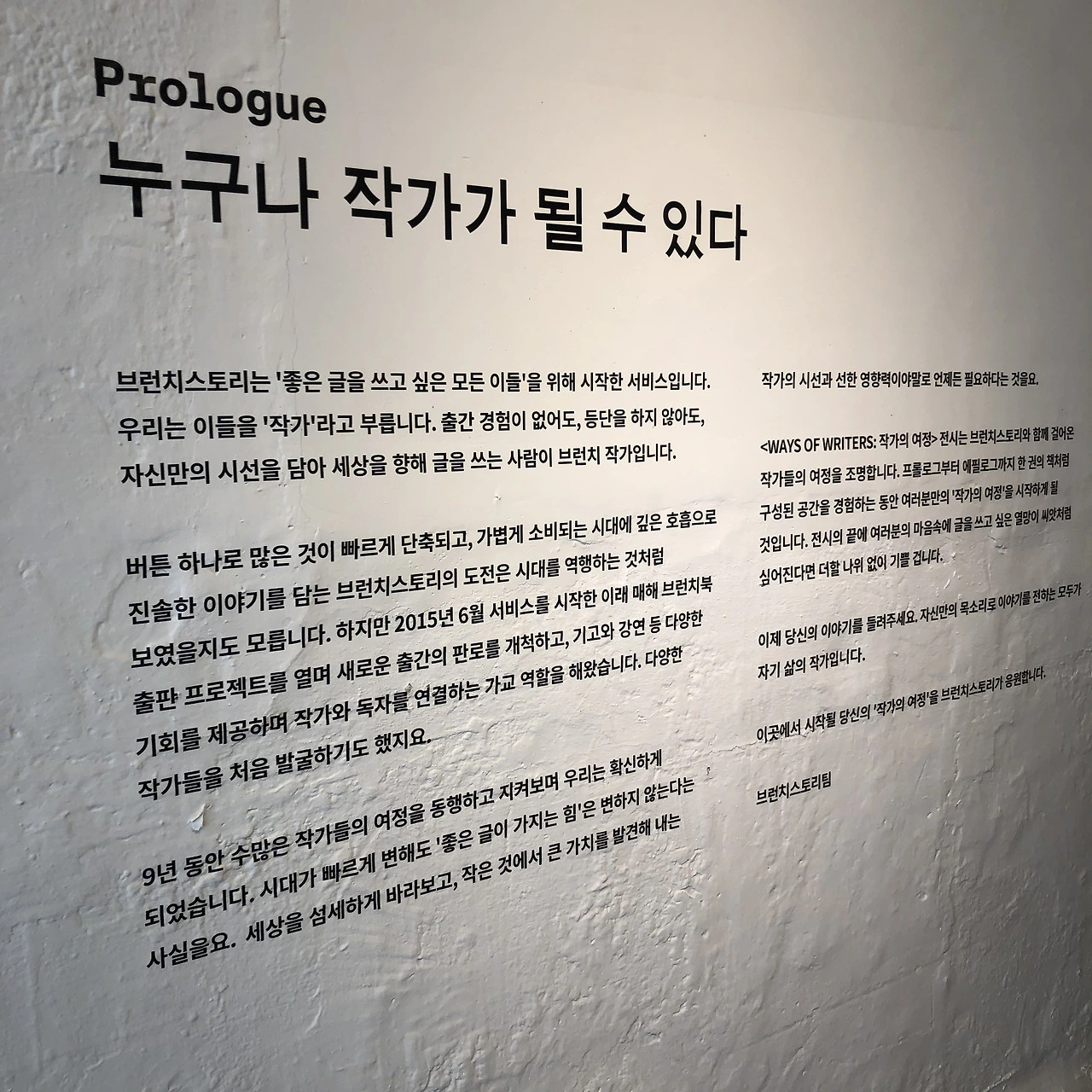 전시 입구에 들어서면 Prologue 누구나 작가가 될 수 있다는 응원글을 볼 수 있습니다. 그렇죠! 쓰기만 하면 작가입니다! 작가는 누구나 될 수 있죠. 다만, 작가로 돈을 벌기는 아주 어려운 게 문제겠지만요. 흠흠! 그래도 자신감을 충전하고 바로 본론으로 들어갑니다.
