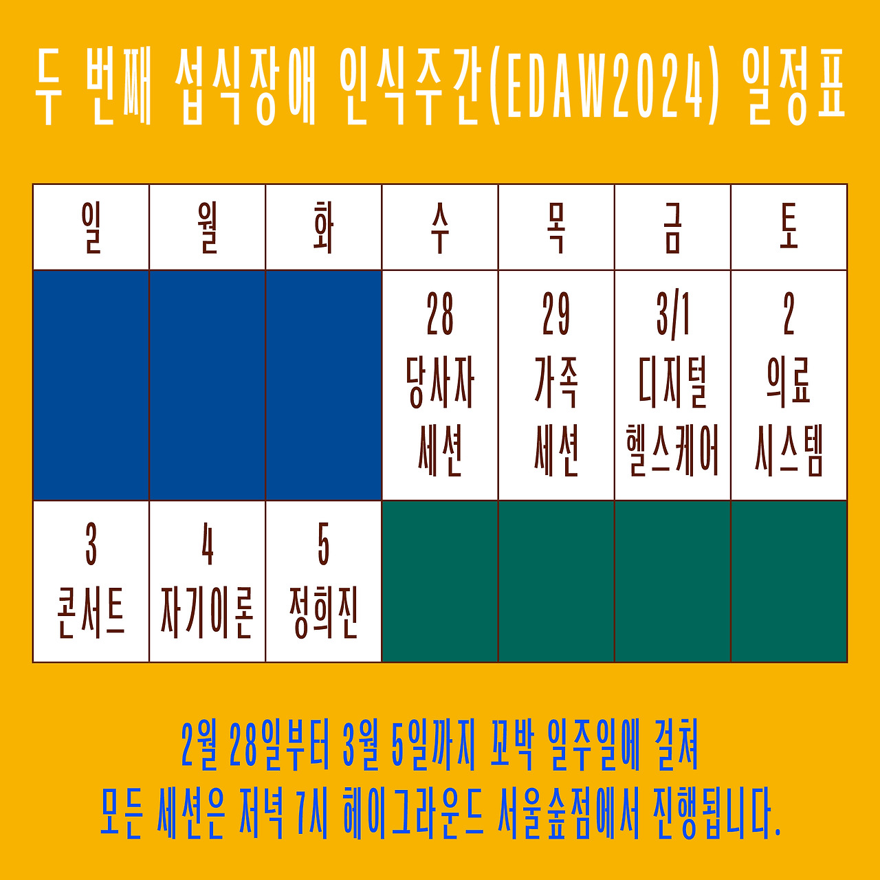 오는 2월 28일부터 3월 5일까지 헤이그라운드 서울숲점 3층 브릭스에서 진행될 두 번째 섭식장애 인식주간(Eating Disorders Awareness Week)은 기업 후원 없이 진행됩니다. 여러분의 많은 관심과 도움이 필요합니다!