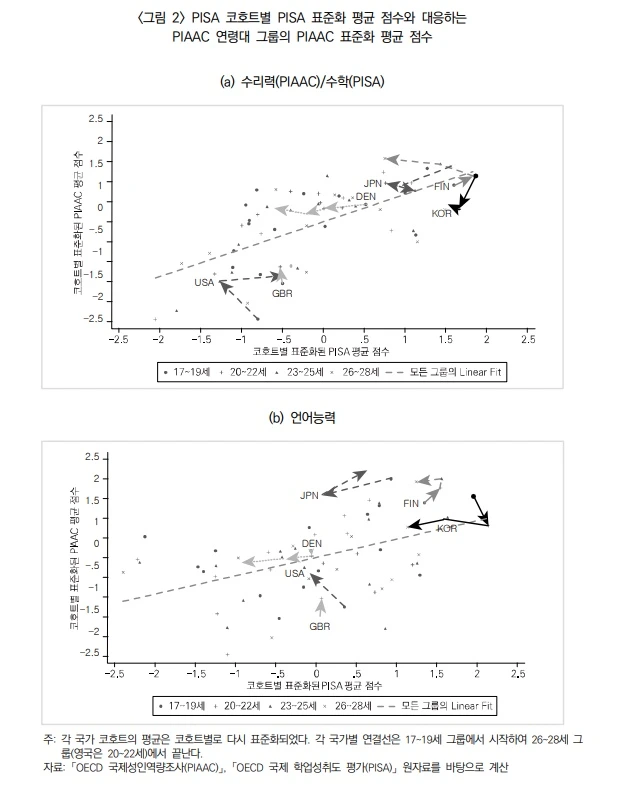 PISA 대비 PIAAC의 성취도 (출처: 한국경제연구원 정책연구 2017-2)