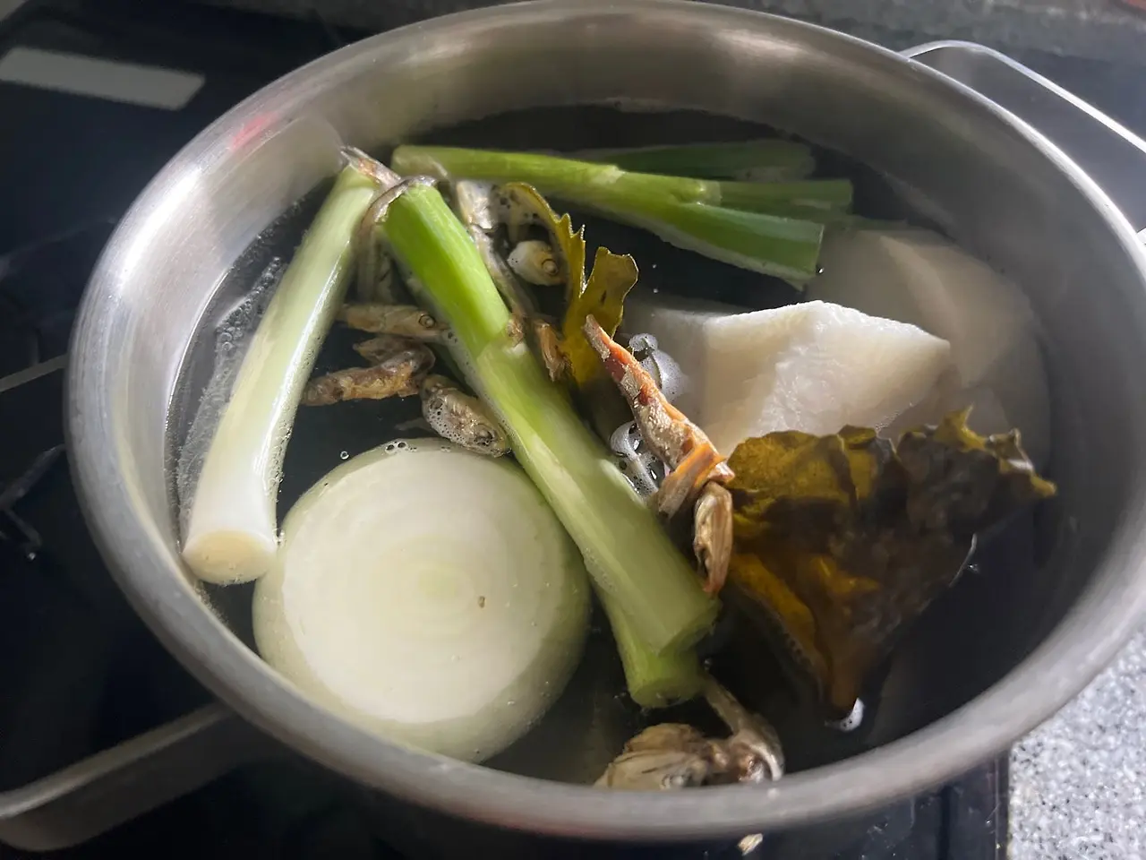 그리고 육수의 핵심인 기장멸치 한웅큼과 다시마를 넣어준다. 30분정도 보글보글 끓이고 소금으로 간을 하면 다른 조미료가 없어도 제법 괜찮은 육수가 된다.