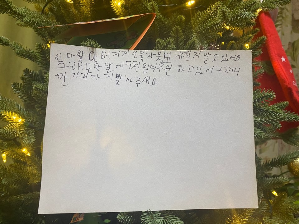선물을 가져갈까 봐 걱정한 막내는 선물 있던 자리에 고이 이 편지를 써놓고 무거운 밸런스보드를 굳이 방안에 넣고 잠이 들었다. 산타할아버지가 이 편지를 못 보고 선물을 반품해 가실까 봐 걱정이 살짝 되는 모양이다.