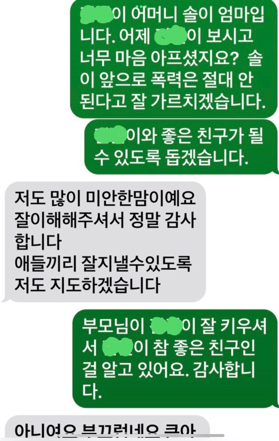 솔이 친구 어머님께 보낸 메시지와 그 친구 어머님의 답장