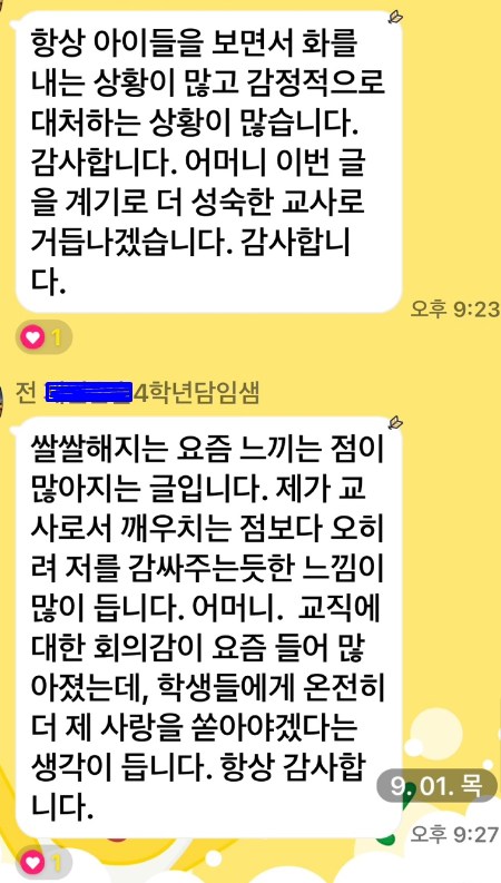 솔이 담임선생님과 주고 받은 메시지