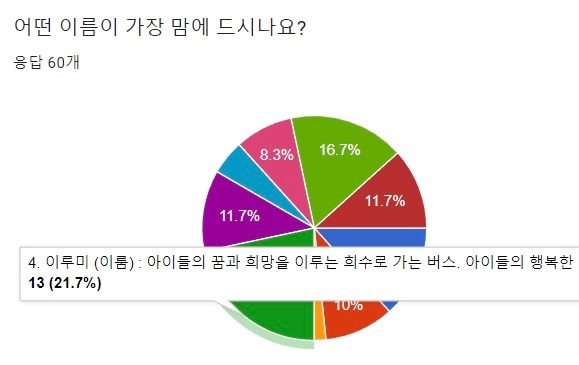결과는 60가정이 투표했고, 21.7로 " 이루미 "가 당선되었다.