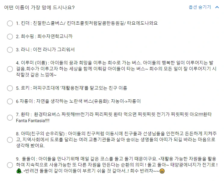 희수자연학교 가족들은 전기버스에 이름을 짓는 공모를 했다. 많은 가족들이 의미를 담아 응모해주셨다.