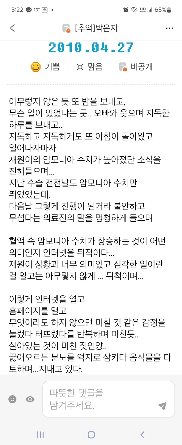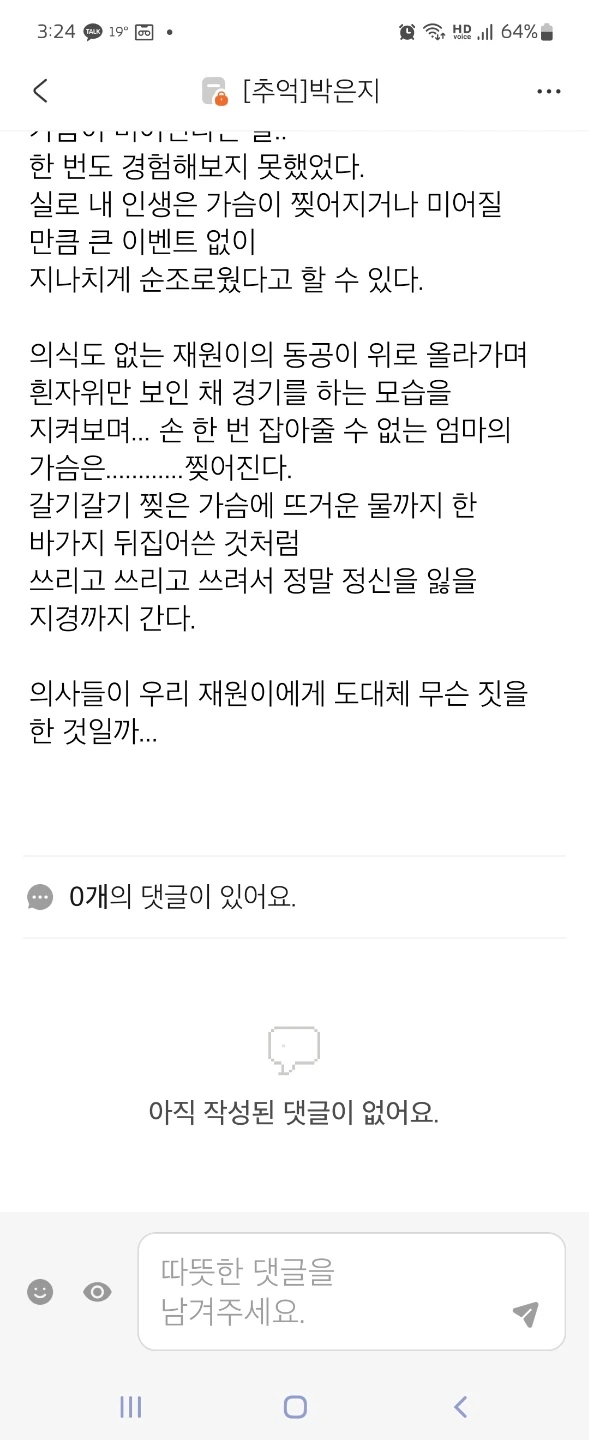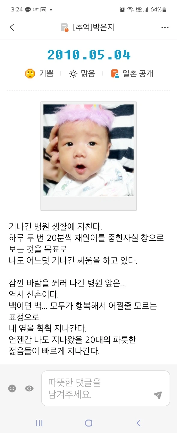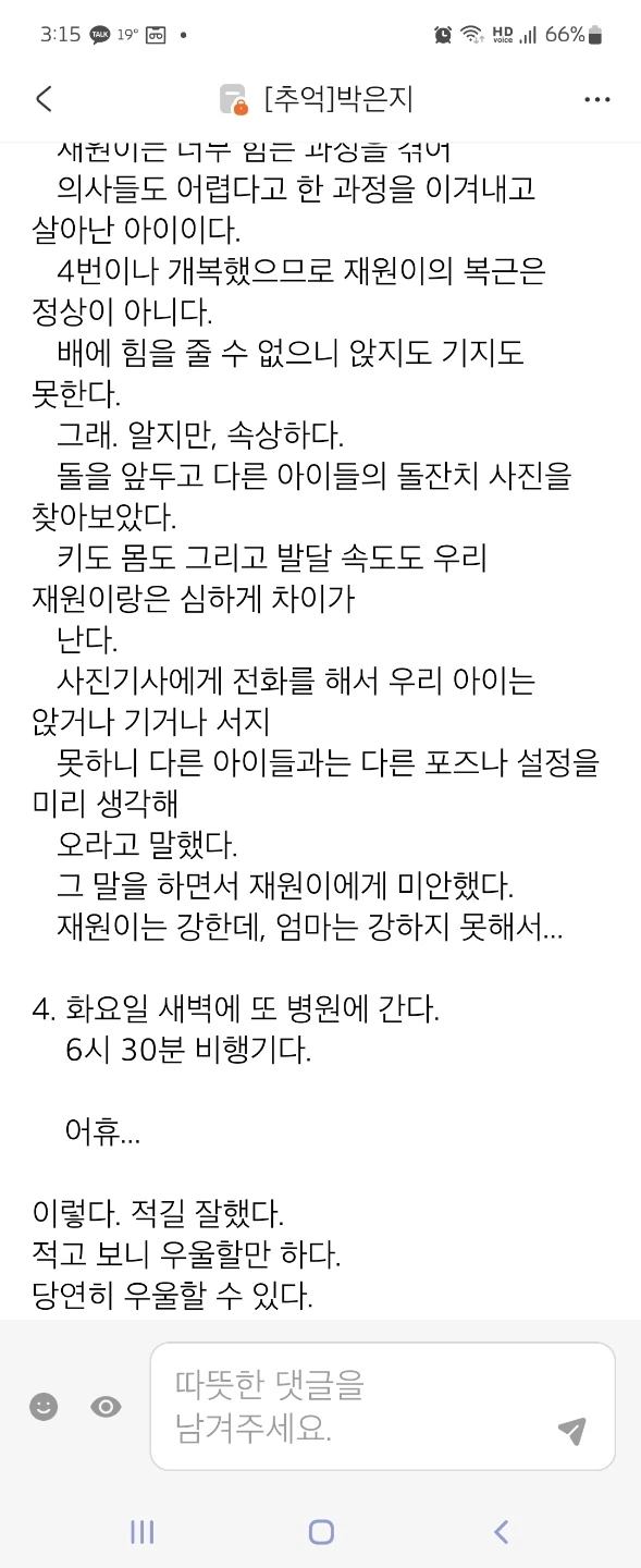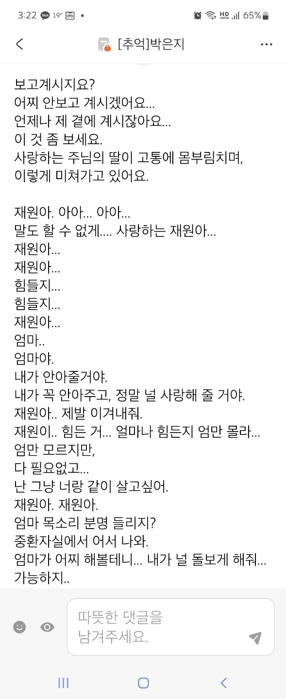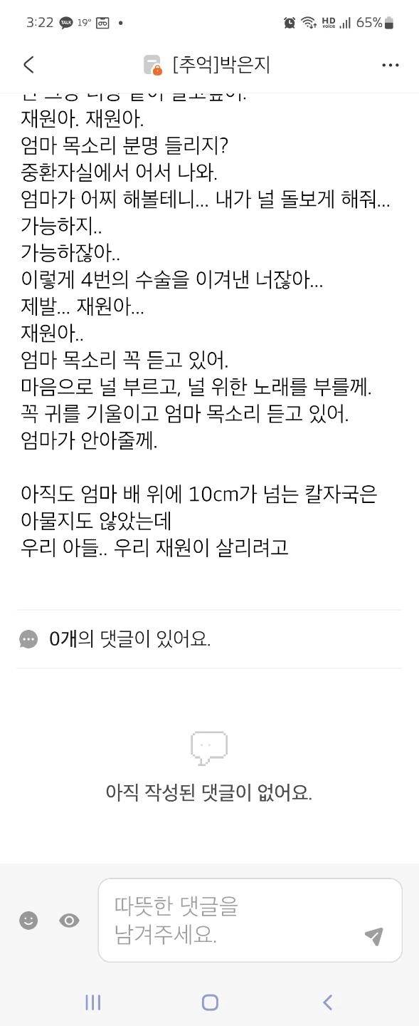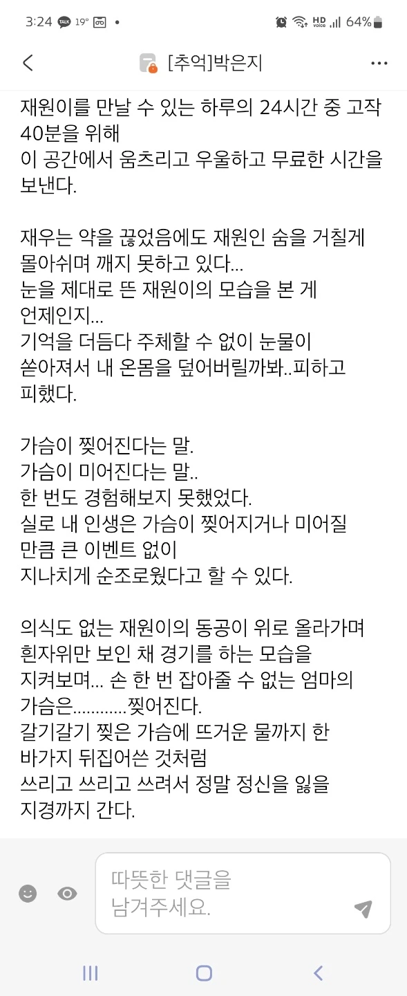 ————————재원엄니께 이 글 보내드리니… 재원이 병상일기를 보내주셨다 공개해도 된다는 허락을 받고 중환자실에 있었던 재원이 이야기 더 올려본다.