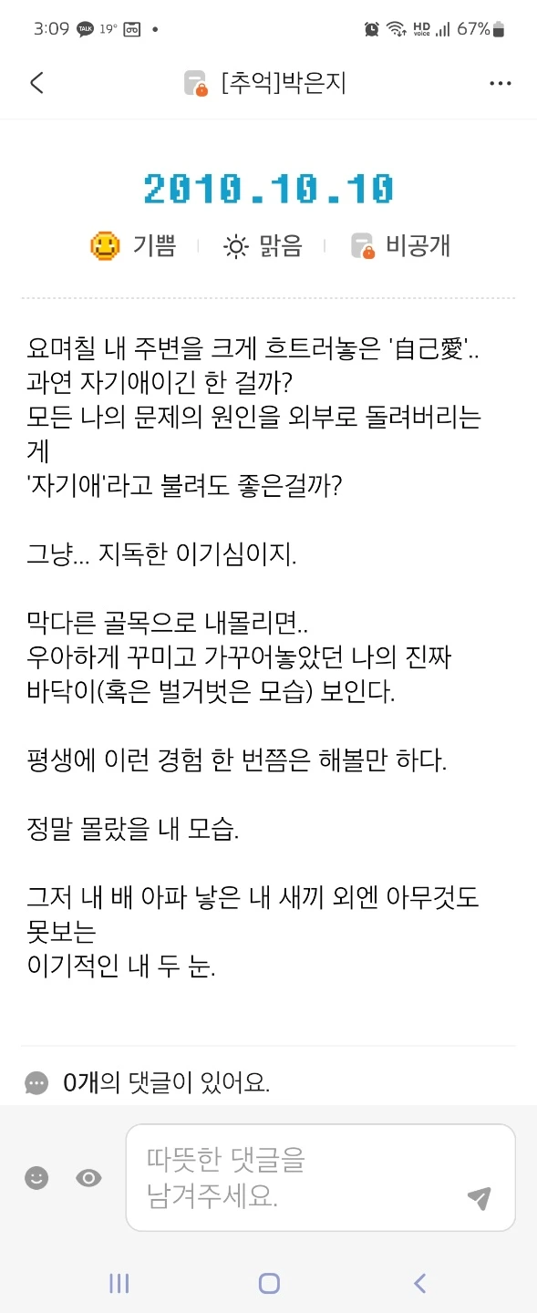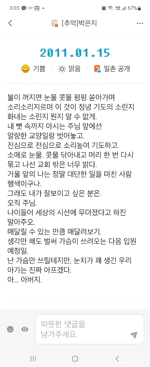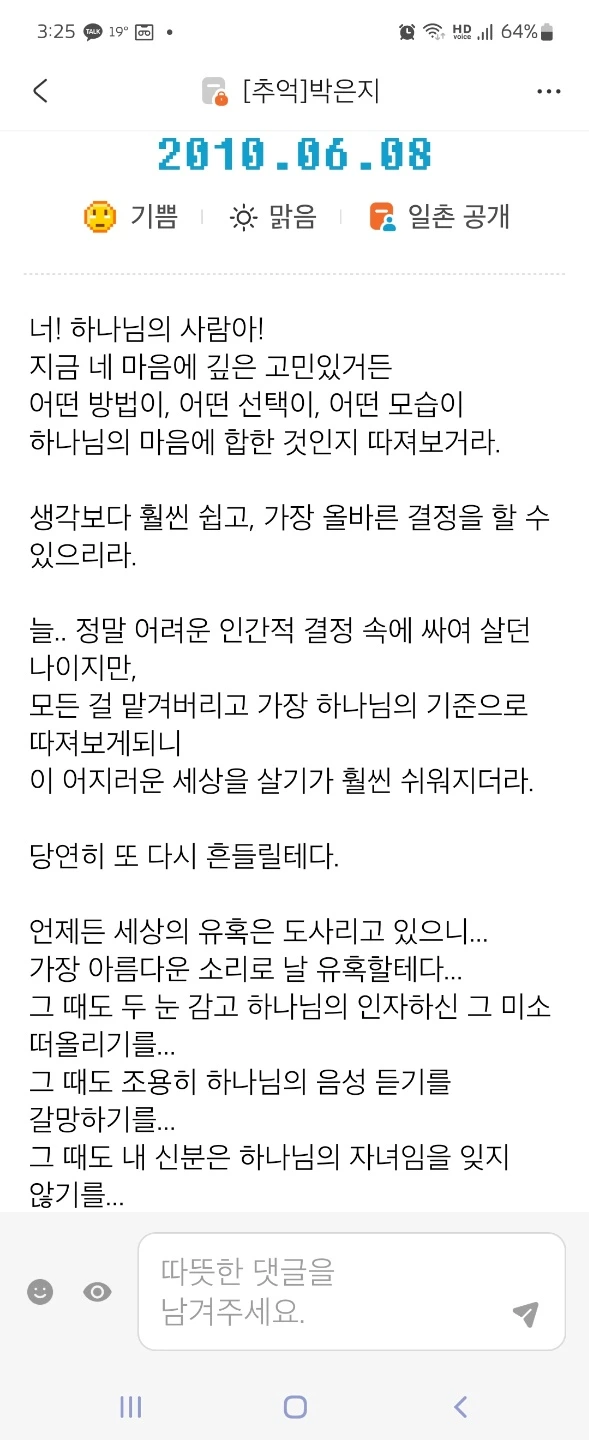 —— 은지님 글 읽으면서 온 몸이 바들 바들 떨린다. 고통을 주님과 솔직하게 나누는 것이 같은 신앙인인데도 놀랍다. ——
