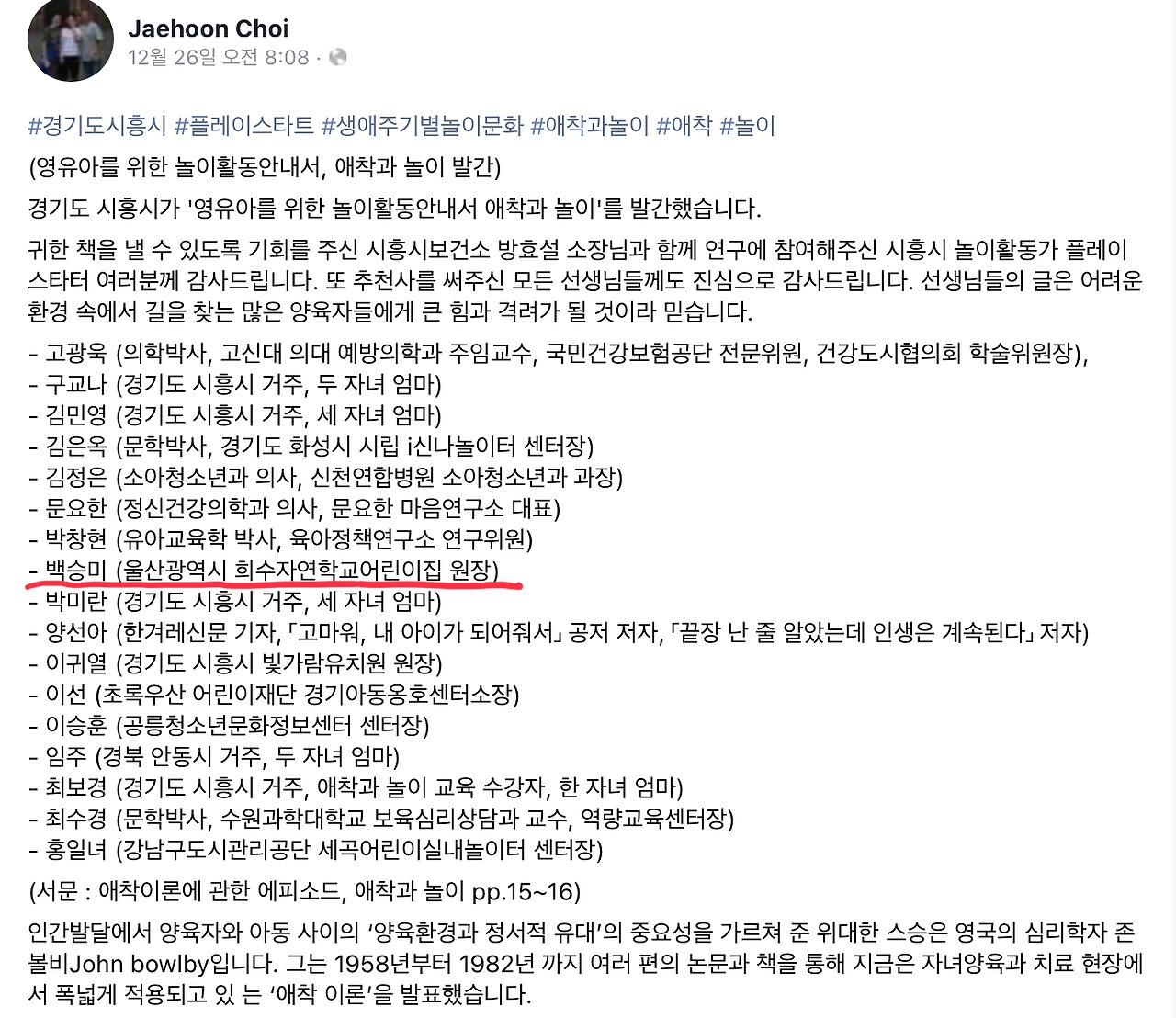 존 볼비의 ‘애착’ 관련 책을 시흥시의 예산으로 출판하신다고 하셨다.