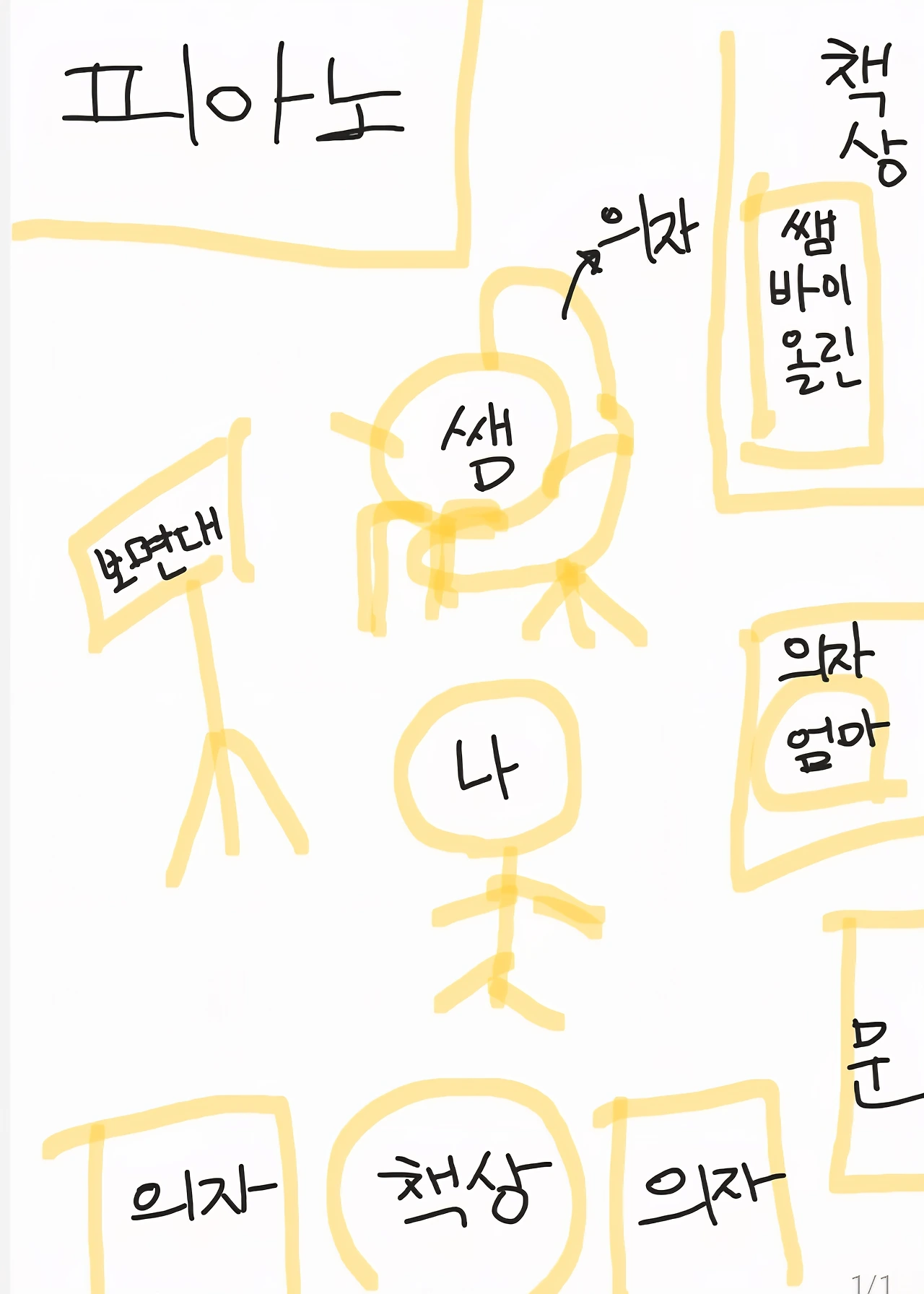 그 레슨실에 들어가면 방 뒤편에 전신거울과 그 옆 조그만 탁자와 두 개의 의자, 문 옆에 또 다른 푹신한 의자와 바이올린과 잡동사니가 올려진 그 옆 커다란 책상, 그리고 그 옆 피아노와 그 앞 선생님의 의자가 있다.