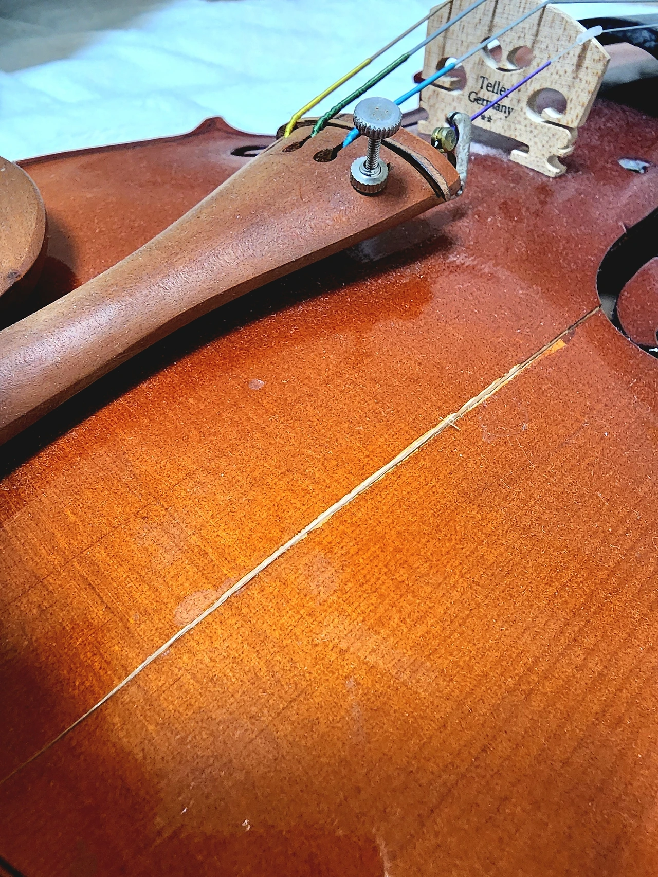 바이올린 앞쪽(앞판) 부분에 발판에 맞은 바로 그 모양대로 금이 쩍 가있었다.