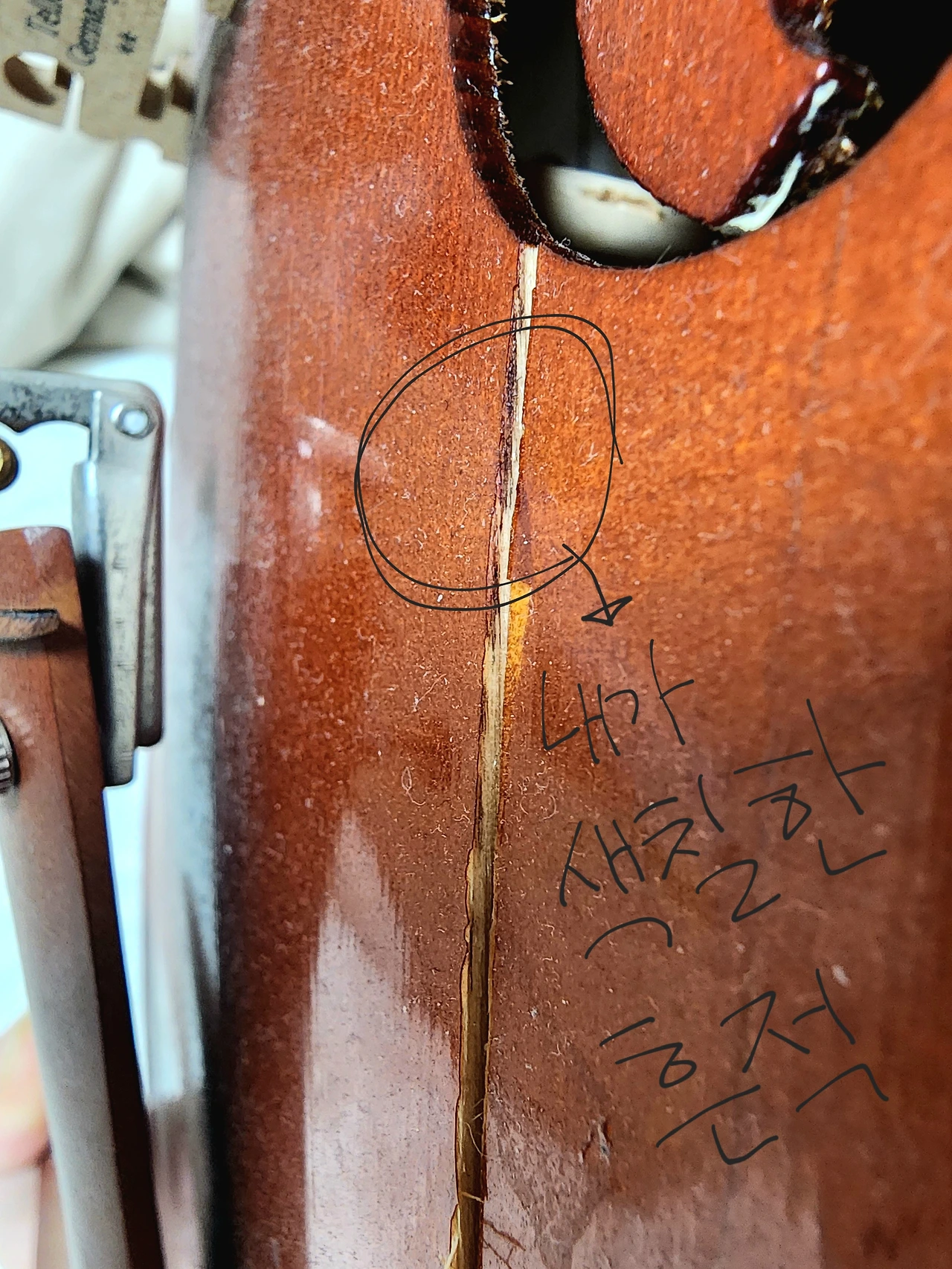 어머니 제가 보니까 소리도 괜찮고 뒤판이 아니라 앞판이 깨진 거라 괜찮을 것 같아요~"
