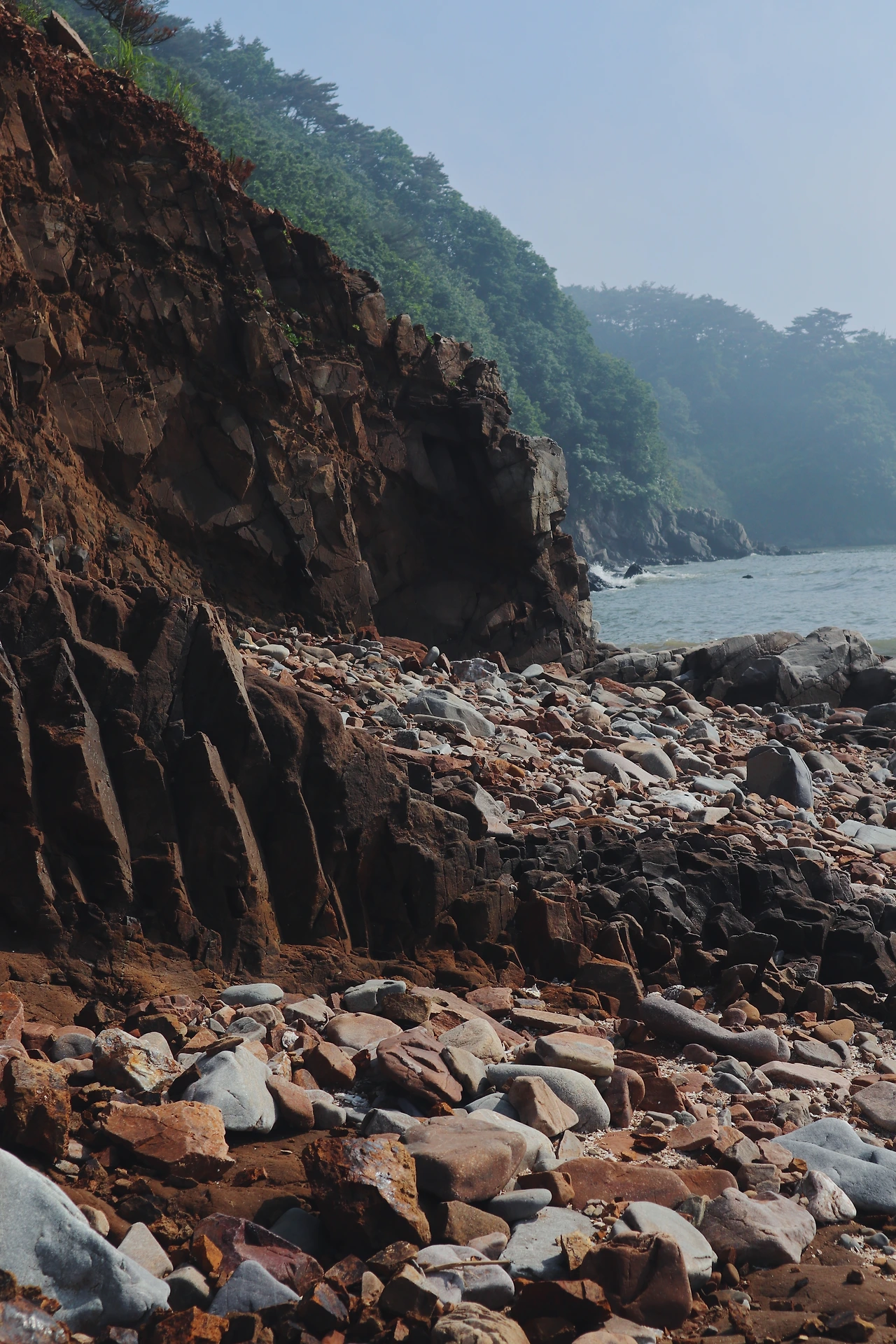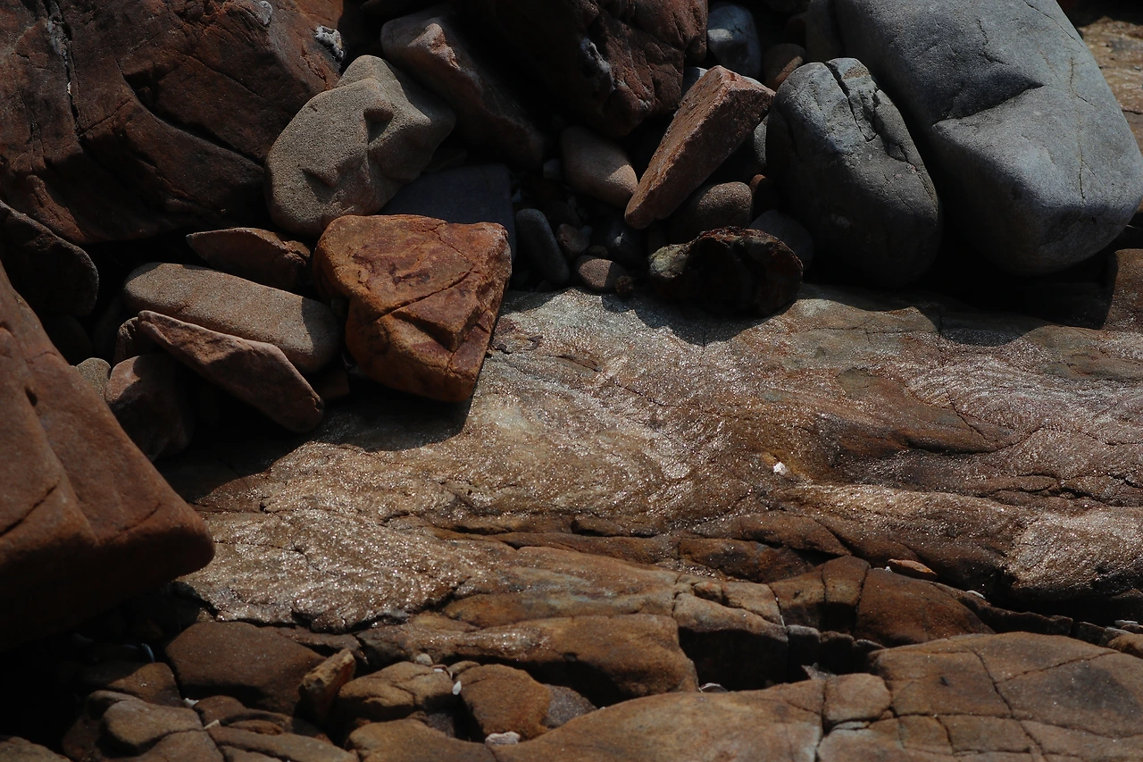 3-3. 사실 서해를 가 본 경험이 일천하다. 그래서 평범한지 특별한지 구분 안 되는 돌의 불그스름한 색깔, 조개껍질이 놀랍도록 많이 함유된 모래사장 같은 게 외국에 온 것처럼 새로웠다. 밧개는 자갈이 많아 돗자리 깔고 앉기엔 불편한데, 그 대신 땅 사진을 생각보다 많이 찍었다.
