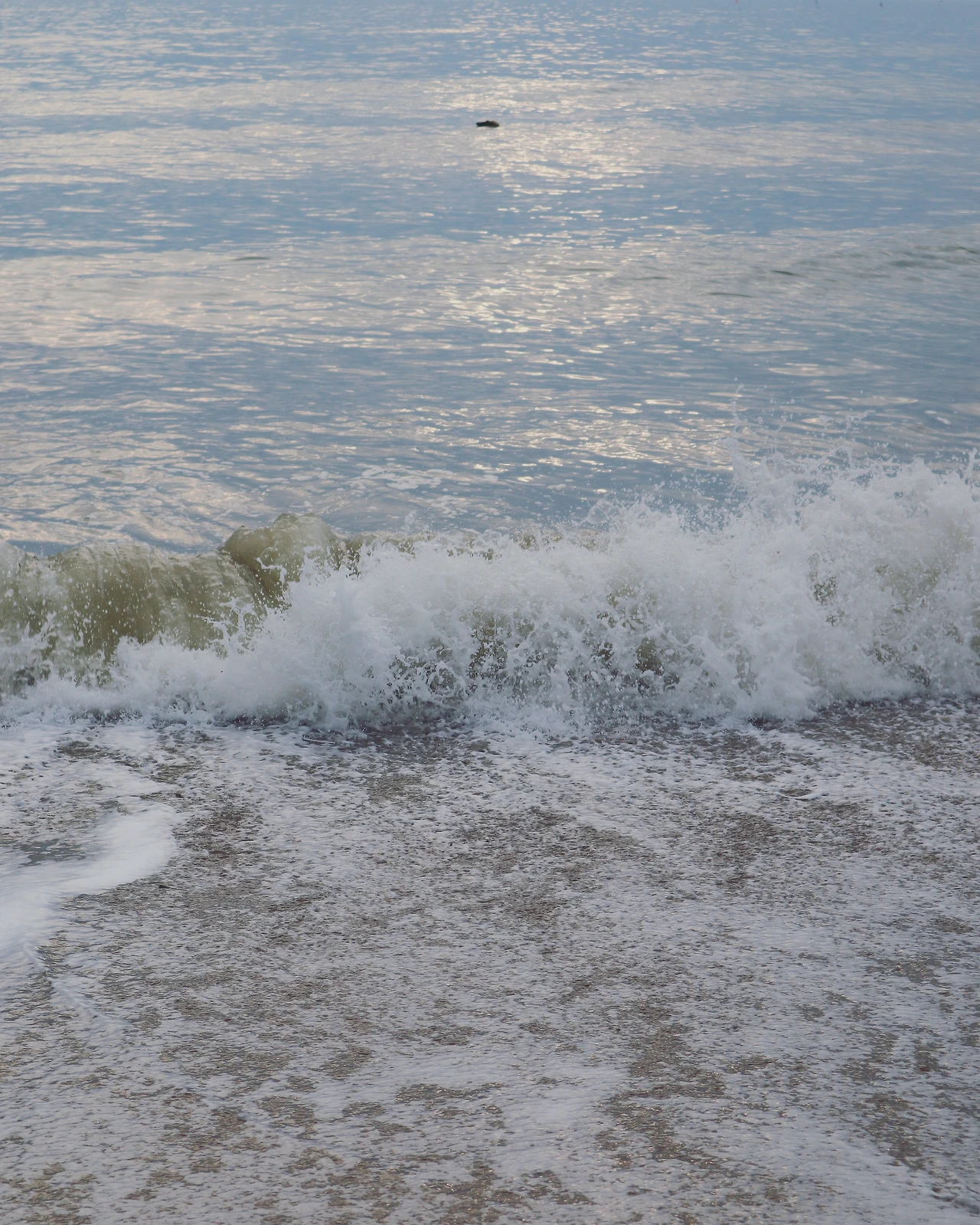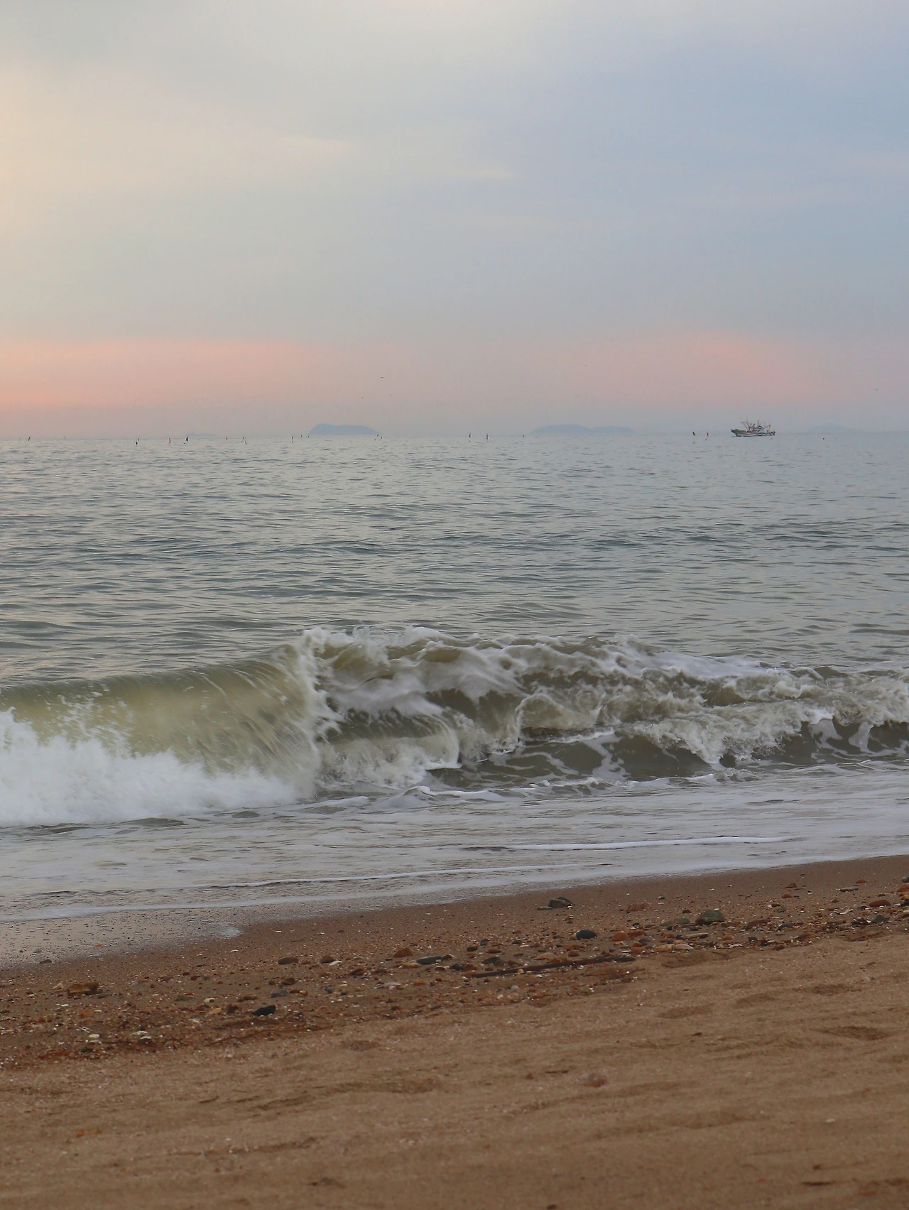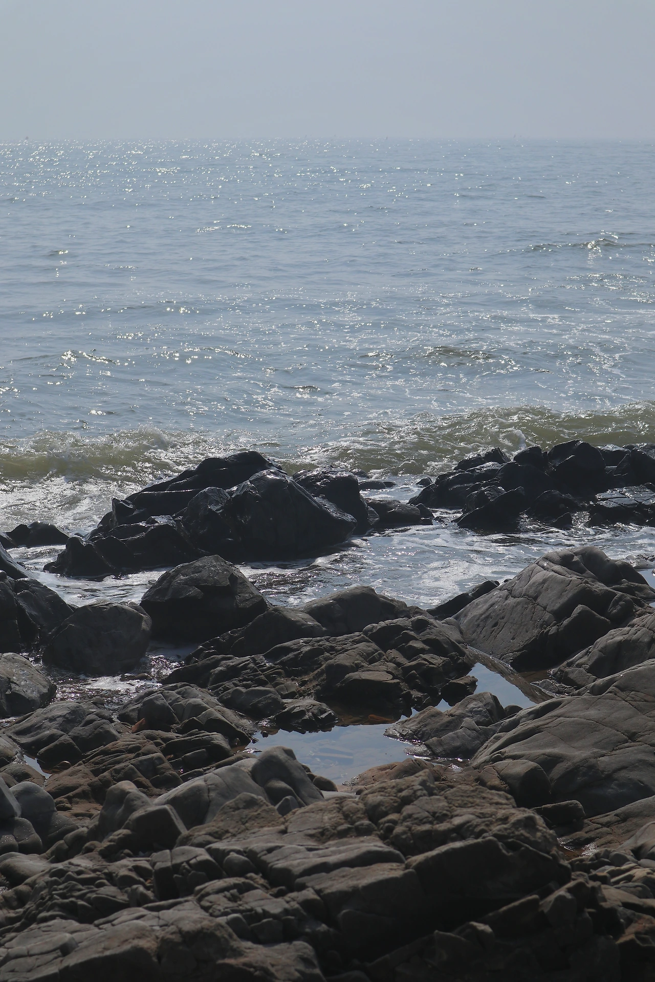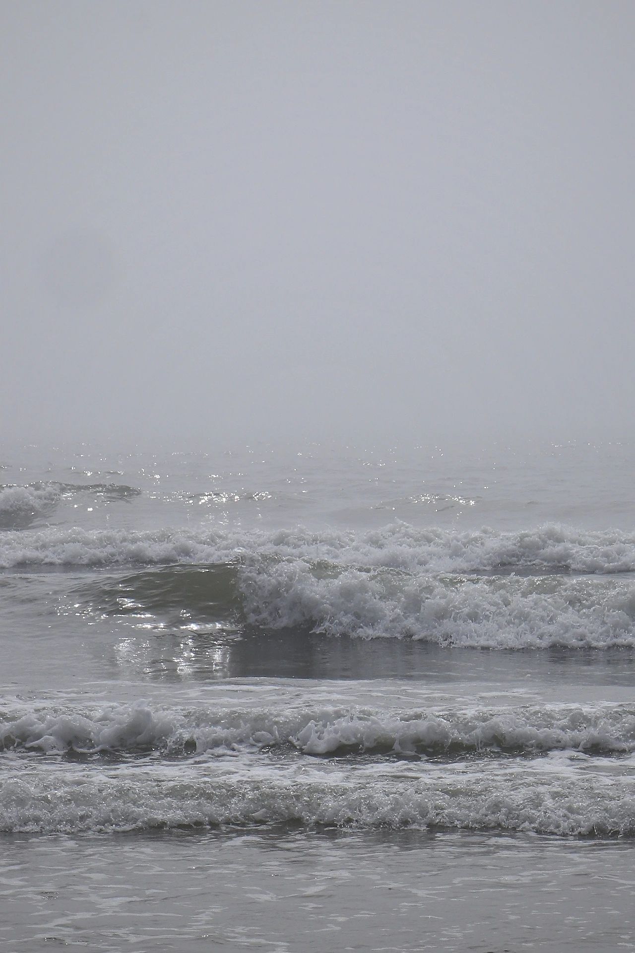 3-1. 그리고 안개가 서서히 흩어진다. 하늘색은 아닌데 회색이 많이 옅어진 상태. 햇빛이 강해지면서 바다 표면에서는 본격적으로 윤슬이 반짝이기 시작했다. 서해 특성상 바닷물 색은 많이 푸르지 않다. 이 특수한 빛 아래에서 바다는 거의 은색에 가깝게 빛났다.
