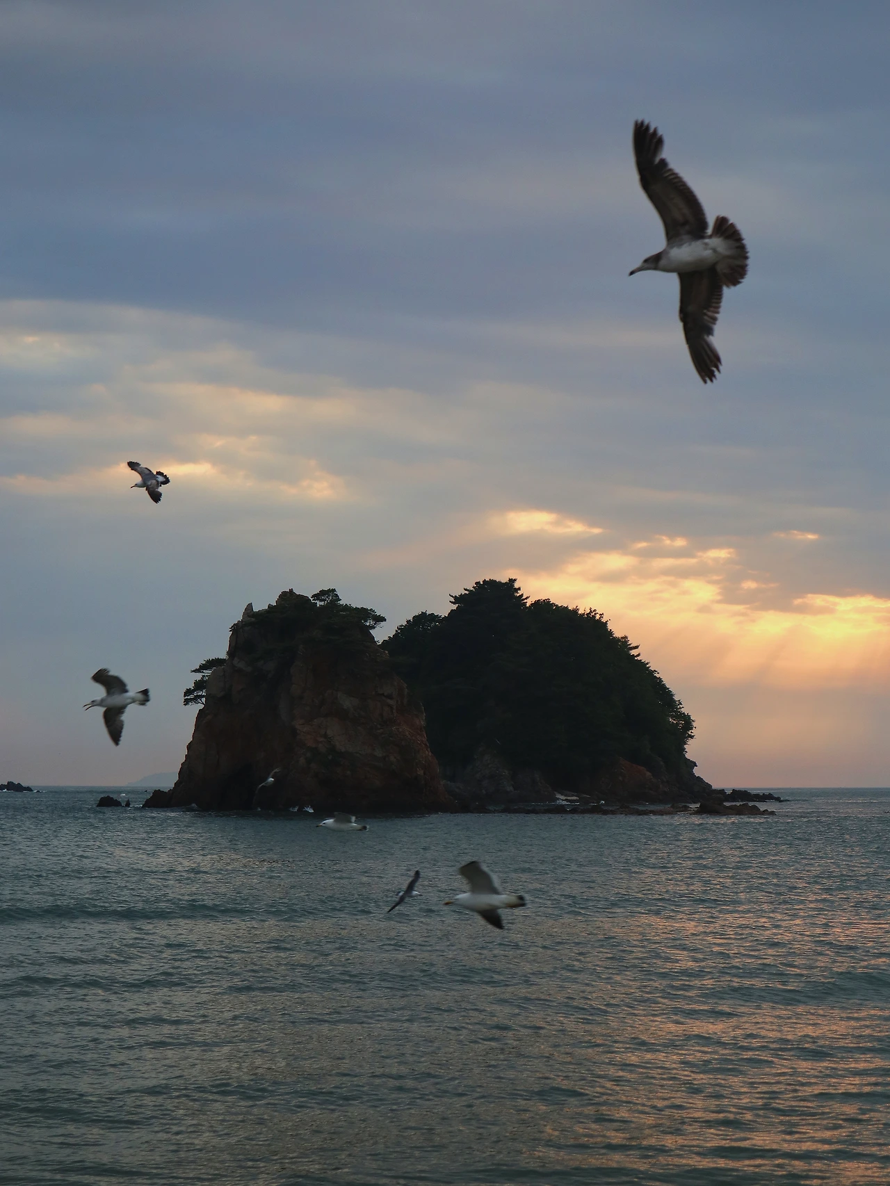 4-2. 석양. 꽃지의 석양은 촬영 명소로 유명하다. 이 날도 할미 할아비 바위 쪽은 망원렌즈가 달린 카메라 십여 대가 쪼르륵 늘어서 있었다. 구름이 꽤 있어서 누가 봐도 감탄할 석양은 아니었지만, 이 상황에서도 뭔가 찾아내는 게 사진가의 능력이겠지. 나는 꽤 헤매다가, 아주 잠깐 구름 밖으로 해가 나왔을 때 찍은 바다에 만족하기로 했다.