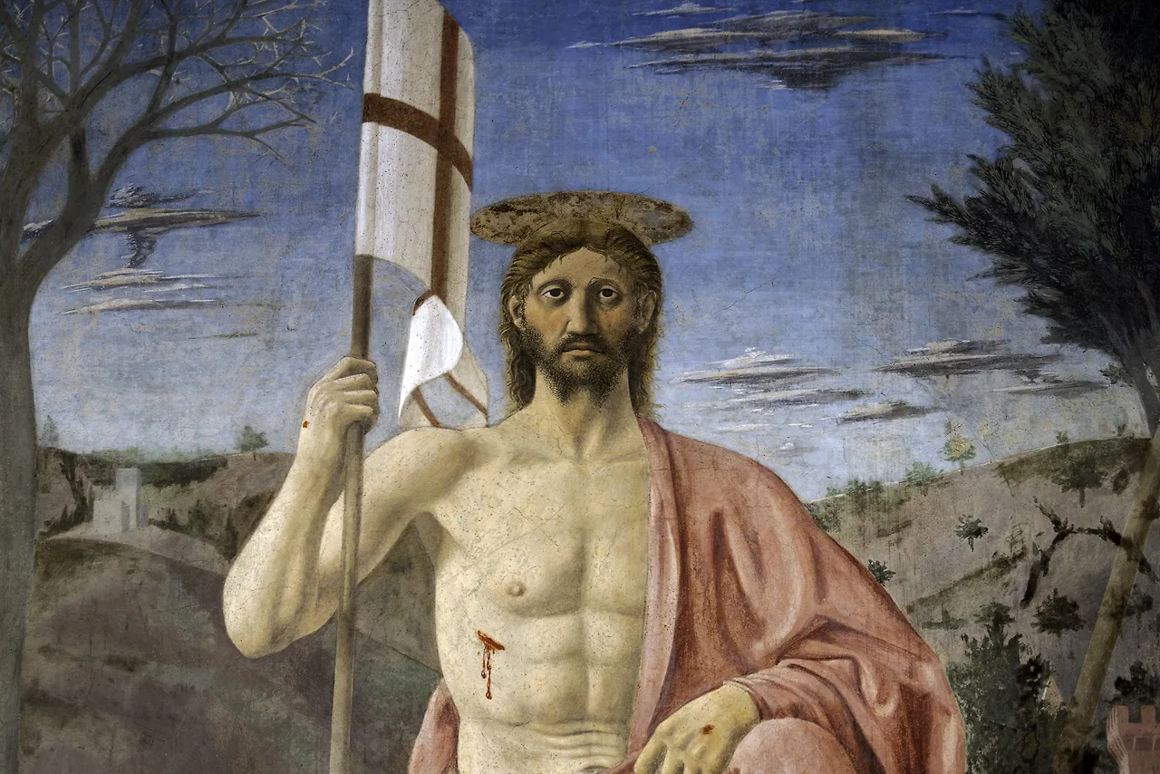이제 ‘세계 최고의 그림’, <부활>로 눈을 돌려 본다. 헉슬리는 ‘고대 그리스의 운동선수처럼 완벽하게 발달한’ 이 그림 속 그리스도의 ‘몸 전체가 육체와 지성의 힘을 표현’한다고 주장하면서, 이 그림에서 고대인이 추구했던 고전적 이상의 부활을 읽었다. 완전히 틀린 해석은 아니겠다. 르네상스 화가에게 고대는 영원한 모범이었고, 피에로 델라 프란체스카 또한 예외는 될 수 없을 테니까. 그러나 이 그림은 근본적으로 종교화에 속한다. 십자가에 매달려 죽었지만 사흘 만에 살아나 승천한다는 놀라운 기적. 당대의 화가들은 대개 이 장면을 그릴 때 신약성서의 관련 구절을 참고해 시간적 배경을 새벽으로 설정했다. 또, 붕 뜬 그리스도의 몸이나 신비로운 빛 같은 것을 자주 그려 넣었다.