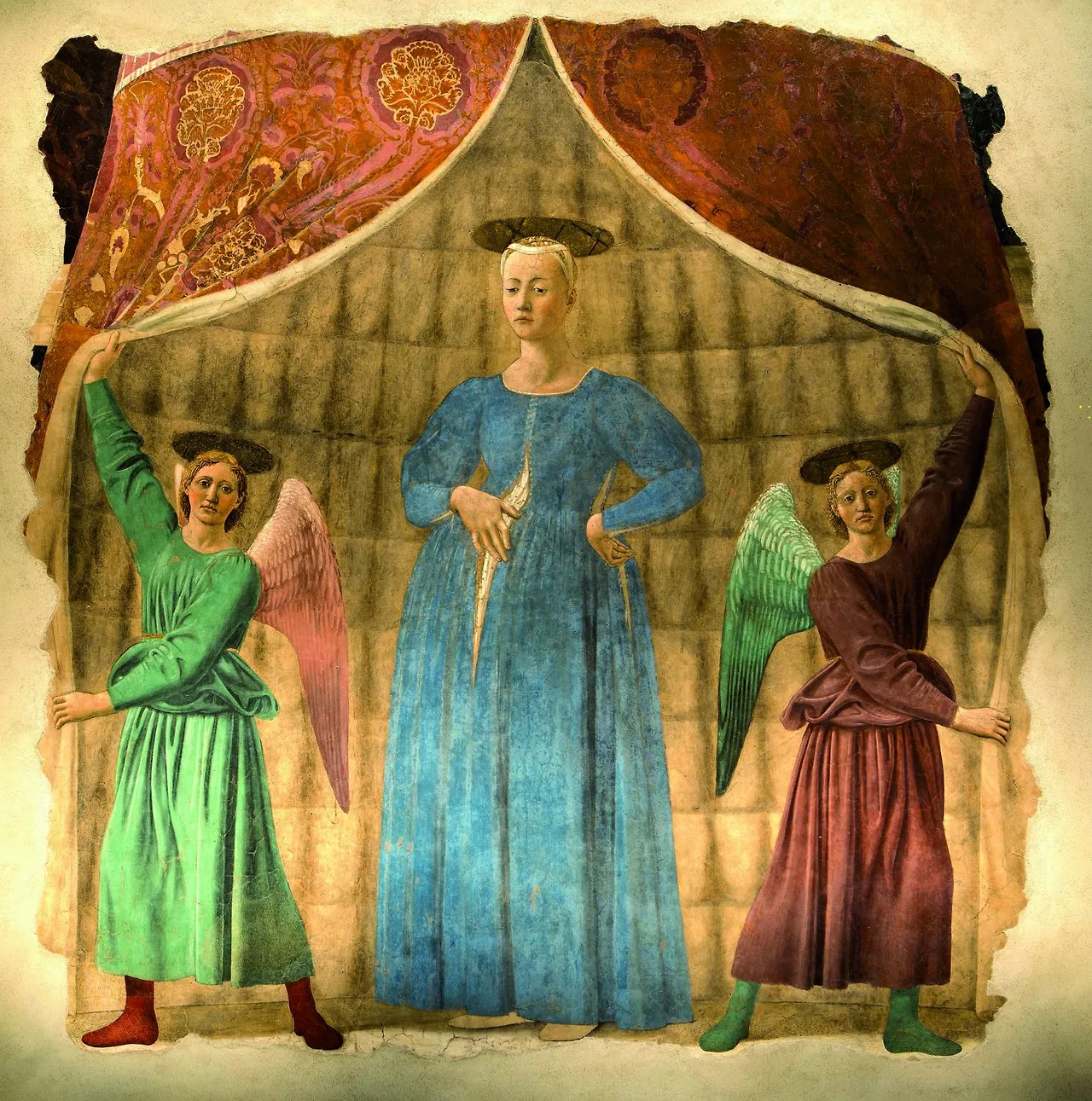 절제된 것은 인물 개개인의 감정과 몸동작만이 아니다. 그의 그림에는 색이 있지만, 색을 더욱 유혹적으로 만드는 광택과 윤기는 없다. 실크와 벨벳이 사라지고 면과 리넨만 남은 세계 같달까. 사실, 피에로의 시대에는 아직 유화 물감이 널리 퍼지지 않아서 이 시대 그림에선 유화의 전매특허인 섬세한 촉감 표현을 찾기 힘들다. (대신 템페라 물감과 프레스코 물감이 사용되었다.) 그러나 온갖 질감과 촉감이 경쟁하는 현대 사회에는 부재 또한 매력적인 대안이자 전통이 된다.