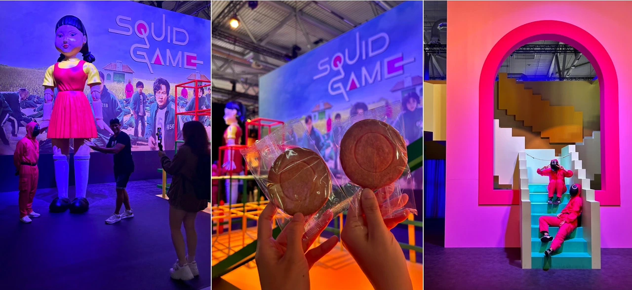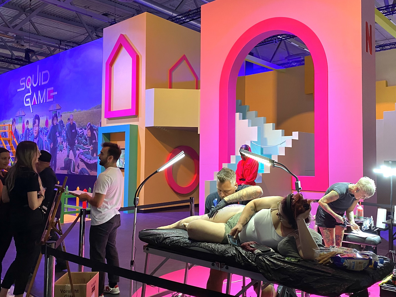 넷플릭스는 '오징어게임, 위쳐시리즈, 웬즈데이, 기묘한 이야기' 등 자사가 보유하고 있는 콘텐츠를 내세워 부스를 채웠다. 게임 시연존은 당연히 없고 영화 세트장 같은 부스에 방문객이 즐길 요소들을 배치하였다. 나도 모르게 넷플릭스 부스에 한참을 머물러 있었는데.. 거대한 부스 한 면을 모두 차지한 오징어게임(Squid Game) 세트장을 보고 국뽕이 차오르기도 했다. 달고나 모양의 쿠키를 얻고 오징어게임에 등장하는 영희와 분홍색 복장의 요원들과 함께 사진을 찍었다. 한쪽에서는 타투 이벤트를 하고 있었는데, 동의서에 서명을 하고 실제 타투를 받고 있는 진귀한 장면이 게임스컴에서는 아무렇지 않게 보였다.