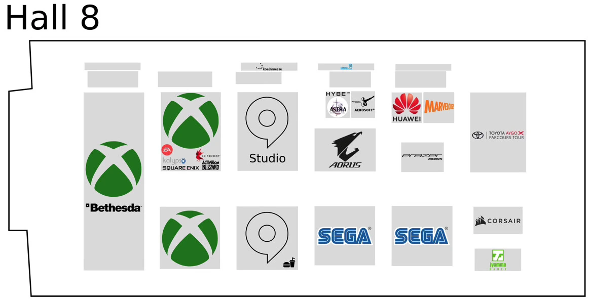 Hall 8 : Microsoft Xbox, SEGA, HYBE IM, Aorus, Erazer, Aerosoft, Freifläche, Corsair, Marvelous