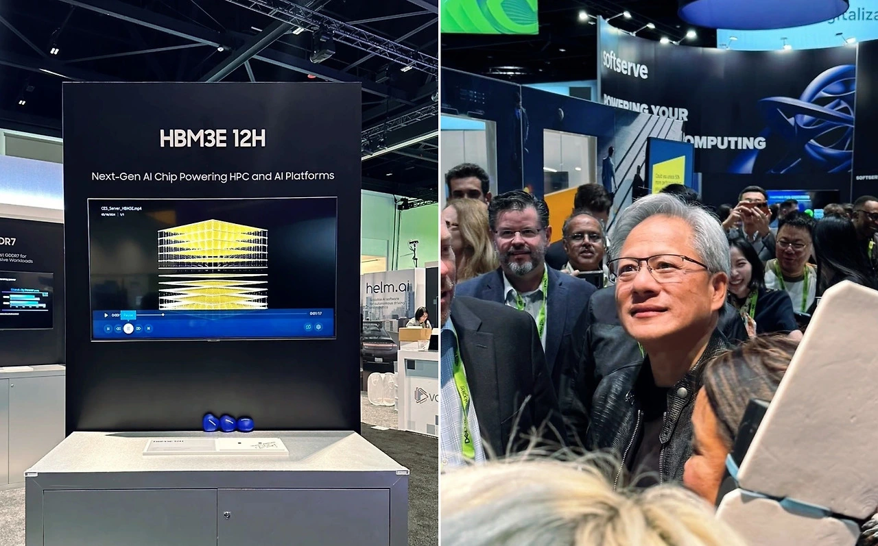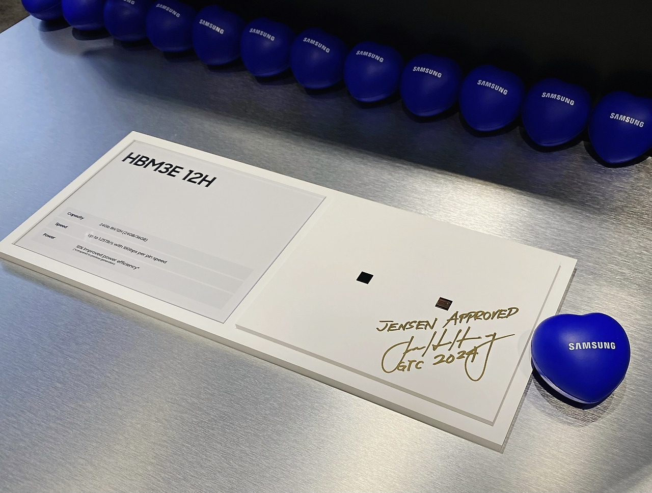 3월 20일 GTC 3일 차, 삼성 부스에 디스플레이된 HBM3E 앞에 젠슨 황은 멈춰 섰다. HBM3E는 삼성이 최근에 엔비디아에 샘플로 제공한 12단의 차세대 HBM인데, 젠슨 황이 그 제품 위에 ‘승인(Approved)’ 사인을 남긴 것이다.