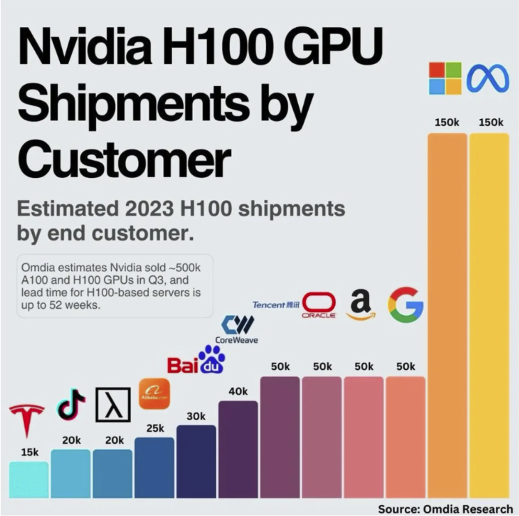 2023년 H100 GPU 출하량을 위 그래프로 살펴보면, 엔비디아의 고객층은 MS, 메타, 구글, 아마존, 텐센트 같은 글로벌 TOP IT기업들이다. 차트에서 스토리가 느껴지는가, AI기술 산업의 권력 구조까지 내재적으로 보여주고 있다. 거대한 자본이 있어야 AI 기술이 가능하고, 이제는 기술적 우위가 아닌 핵심자원 H100 보유 능력이 있어야만 AI 경쟁에서 살아남을 수 있는 것이다. 그리고 하나 더,