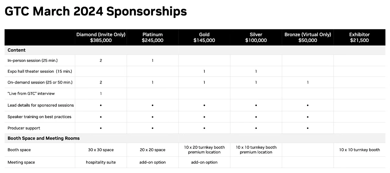 GTC 전시는 스폰서십 형태로 참가할 수 있는데 등급에 따라 부스 규모와 혜택이 달라진다.