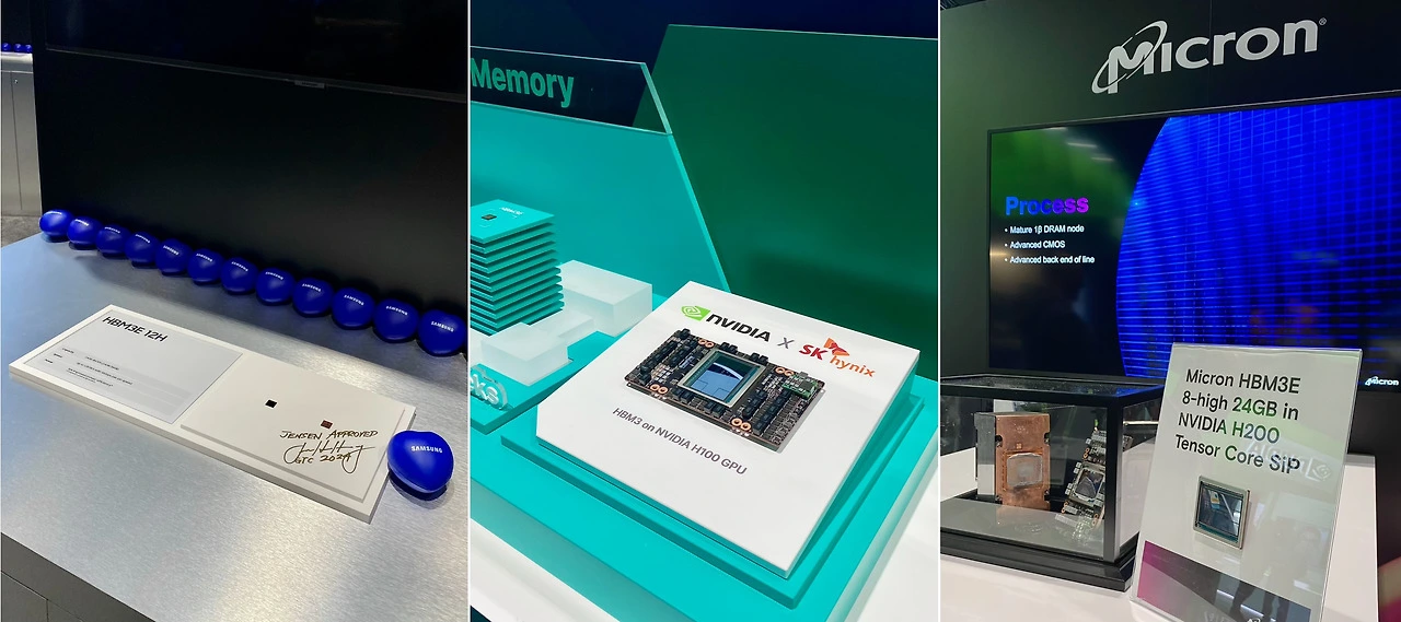 삼성전자, SK하이닉스, 마이크론은 이번 GTC에서 전시 부스를 마련하고 최신 제품인 HBM3E 실물을 공개했다. 엔비디아가 누구의 손을 들어줄지 관심이 집중된 상황에서 젠슨 황 CEO의 삼성 HBM "APPROVED" 사인은 이슈가 될 수밖에 없었다.