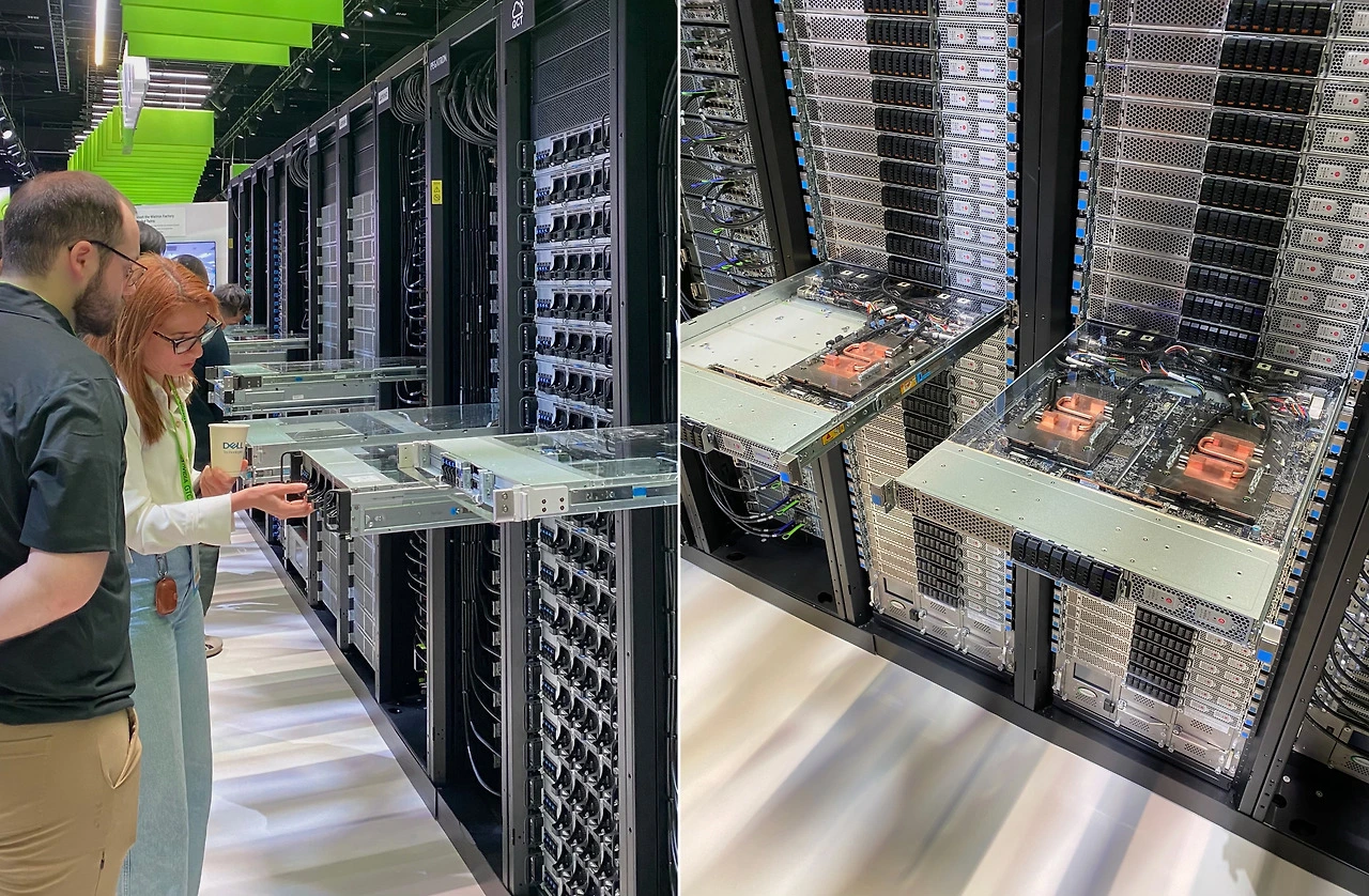 특히 엔비디아 기술의 끝판왕인 'DGX GB200 NVL72'는 블랙웰 GPU 72개와 그레이스 CPU 36개가 결합된 AI 슈퍼컴퓨터다. 기존 H100보다 30배나 빠른 추론 성능을 갖췄다니.. 얼마나 업그레이드를 시킨 건가. 엔비디아 부스에 서버랙으로 설치된 'GB200 NVL72' 앞은 그야말로 인산인해였다.