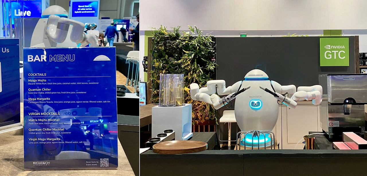 엔비디아의 AI기술의 결정체는 휴머노이드(인간형) 로보틱스였다. 젠슨 황은 키노트 후반부를 AI의 '다음 물결(next wave)'로 로봇을 예고했다. 나는 실제로 전시장 안팎에서 여러 종류의 로봇들을 만났는데, 눈길을 사로잡은 건, 엔비디아의 바텐더 로봇이었다. 별도로 마련된 F&B 부스에서 동그랗고 귀엽게 생긴 로봇이 팔을 열심히 움직이며 칵테일을 제조했다. 완벽한 레시피와 현란한 플레이가 더해진 칵테일은 많은 사람들의 관심을 샀다. 휴머노이드 로봇이야말로 인공지능의 하이라이트였다.