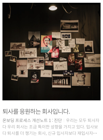 신규 입사자가 첫 출근을 하고, 업무를 배우고, 경력을 쌓고, 퇴사하기까지, 모든 과정이 마냥 즐겁지만은 않겠지만 우린 모두 이곳에서의 기억이 아름다운 추억이 되길 바라는 마음을 가지고 있다. 하지만 첫 시작의 감정은 설렘과 긍정적 기운이 충만할지 몰라도 헤어질 때 과연, 우리는 그럴 수 있을까?