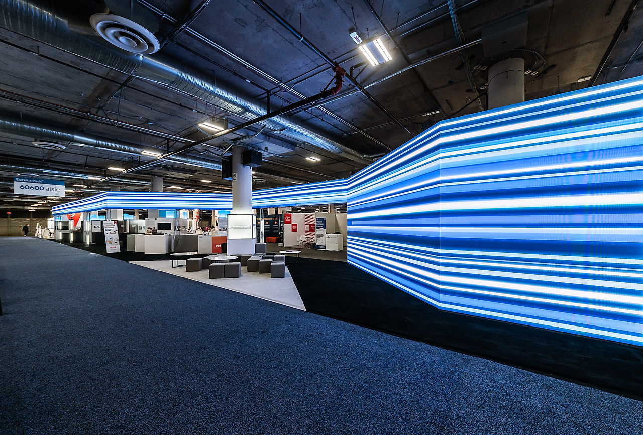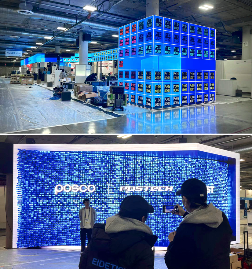 큐브 형태의 메인 LED가 장시간에 걸쳐 설치되었다. LED에 상영되는 콘텐츠 또한 우리가 제작하였는데, 현장에서 3D로 영상을 구현해 보니, 약간의 디테일을 위해 보정이 필요하였다. 지금 잠이 중요하랴, 라스베가스 현장에 있는 디자인 팀장 Kimmi와 서울에 있는 영상팀이 시차를 넘어 협업하여 영상을 완성시켰다. 컴퓨터 모니터 화면으로 보이던 영상과는 확연히 다른 LED 연출은 포스코에서도 기대 이상으로 느꼈던 것 같다. 현장감이 더 느껴질 수 있도록 영상에 모션을 추가하는 등 추가적인 요구사항들이 갑자기 생겨났다. Kimmi는 한정된 시간 동안 영상 퀄리티를 높이기 위해, 전시 오픈 하루 전날까지 영상 제작에 영혼을 불태웠다.
