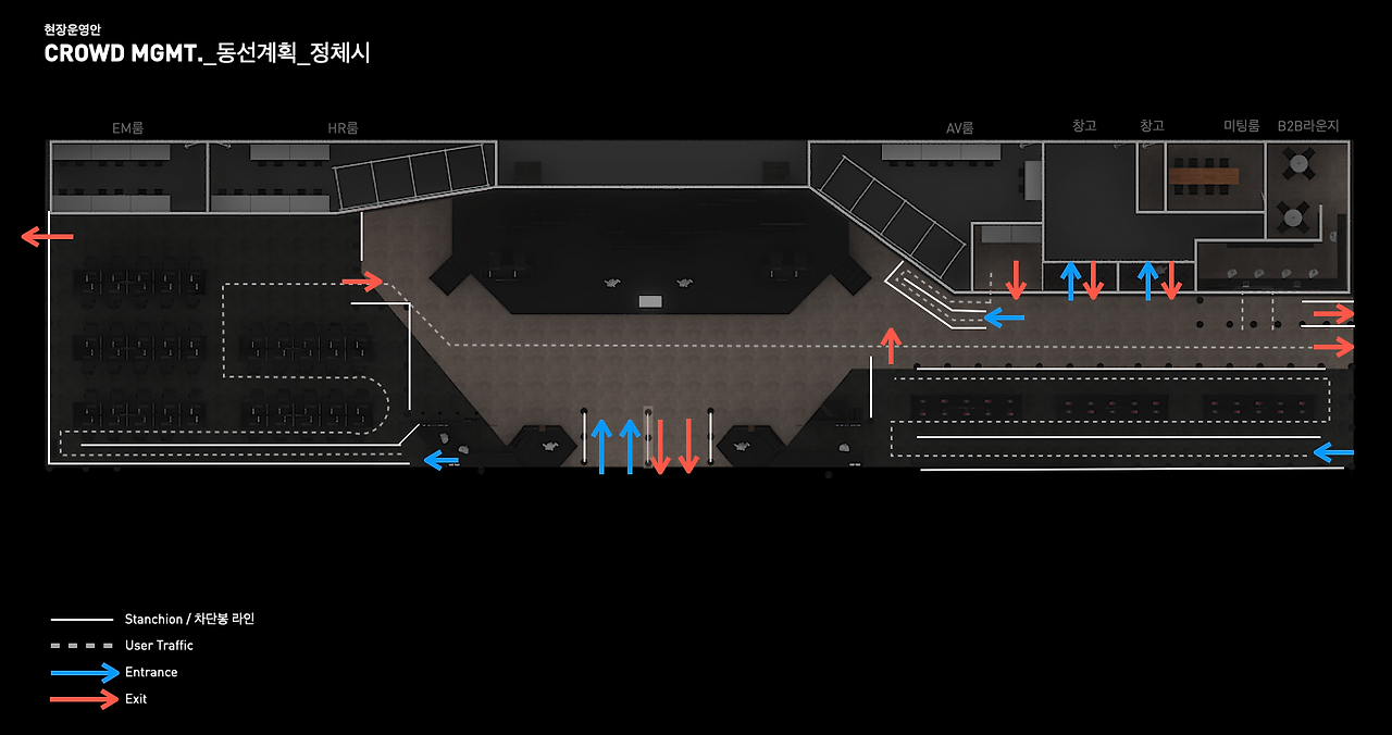 기존에는 부스 외부에 관람객 대기 공간이 있고 차단봉을 배치했다면, 올해는 ‘부스 내부 공간에 차단봉 배치’로 규정이 변경됐다. 우리는 이에 맞게 Floor plan, 차단봉 가이드를 빠르게 수정하여 지스타 사무국과 소통했다. (디자이너의 밤샘은 계속되었다..) 운영 총괄 팀장은 관람객 밀집 상황에서 벌어질 수 있는 상황에 대비하여 관람객 혼잡도 관리 방안, 비상시 출구 개방 및 대피 동선 방안, CPR(심폐소생술) 시행 가능 인력 배치 등 매뉴얼을 마련했다. 그리고 부스 내부에 머무를 수 있는 제한 인원에 대하여 자체 시뮬레이션을 통해서 여러 방편으로 준비를 해 두었다. 전시 오픈 전까지 모두 전사적으로 안전 관리 리허설을 계속하였다. '관람객 일반 입장 시, 제한 입장 시, 입장 정체 시' 등 부스 트래픽 컨트롤을 위해 운영요원들과 합을 맞추었다.