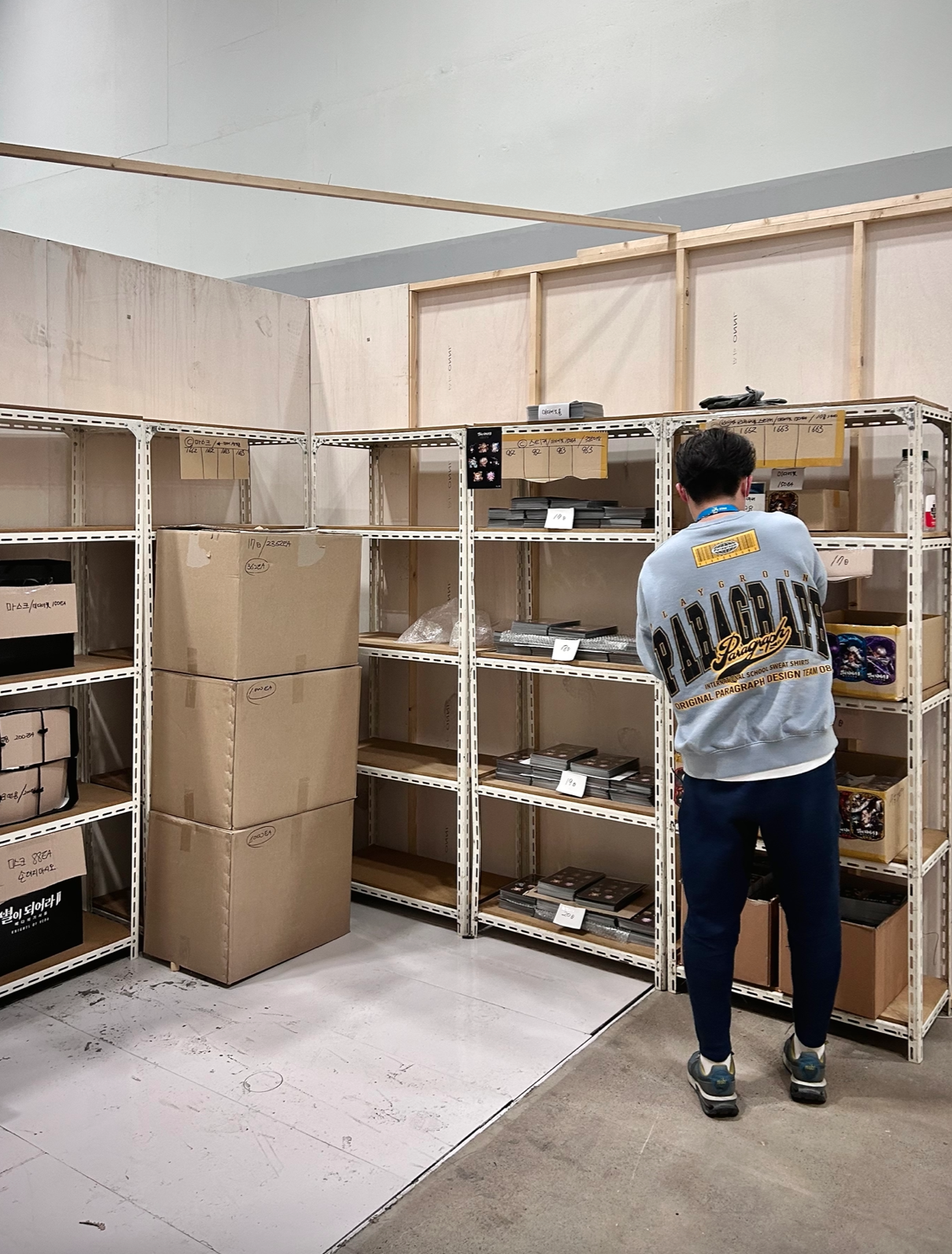 보통 전시 현장의 창고를 생각하면 빼곡히 쌓인 박스들 틈에 갇혀, 좁은 공간에서 땀을 흘리며 막일하는 모습을 떠올리기 마련이다. 실상은 달랐다. 노홍철에 버금가는 규칙적으로 나열된 굿즈들과 촘촘히 정리된 쇼핑백, 수량별 체크리스트가 선반마다 붙여져 있었다. 최실장님의 꼼꼼한 성격의 완성체였던 창고는 전시 기간 내내 핫했다. 스탭룸, AV룸, 그 어떤 룸보다도 쾌적하고 깔끔해서 운영요원들은 창고를 구경하느라 문전성시를 이룰 정도였다.
