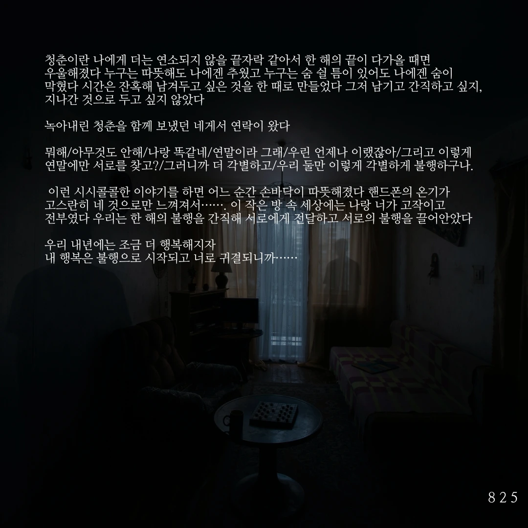 우리의 청춘은 너무 아팠다 불을 피워도 녹아내리는 촛농처럼 우리는 곪아갔다 청춘이란 나에게 더는 연소되지 않을 끝자락 같아서 한 해의 끝이 다가올 때면 우울해졌다 누구는 따뜻해도 나에겐 추웠고 누구는 숨 쉴 틈이 있어도 나에겐 숨이 막혔다 시간은 잔혹해 남겨두고 싶은 것을 한 때로 만들었다 그저 남기고 간직하고 싶지, 지나간 것으로 두고 싶지 않았다