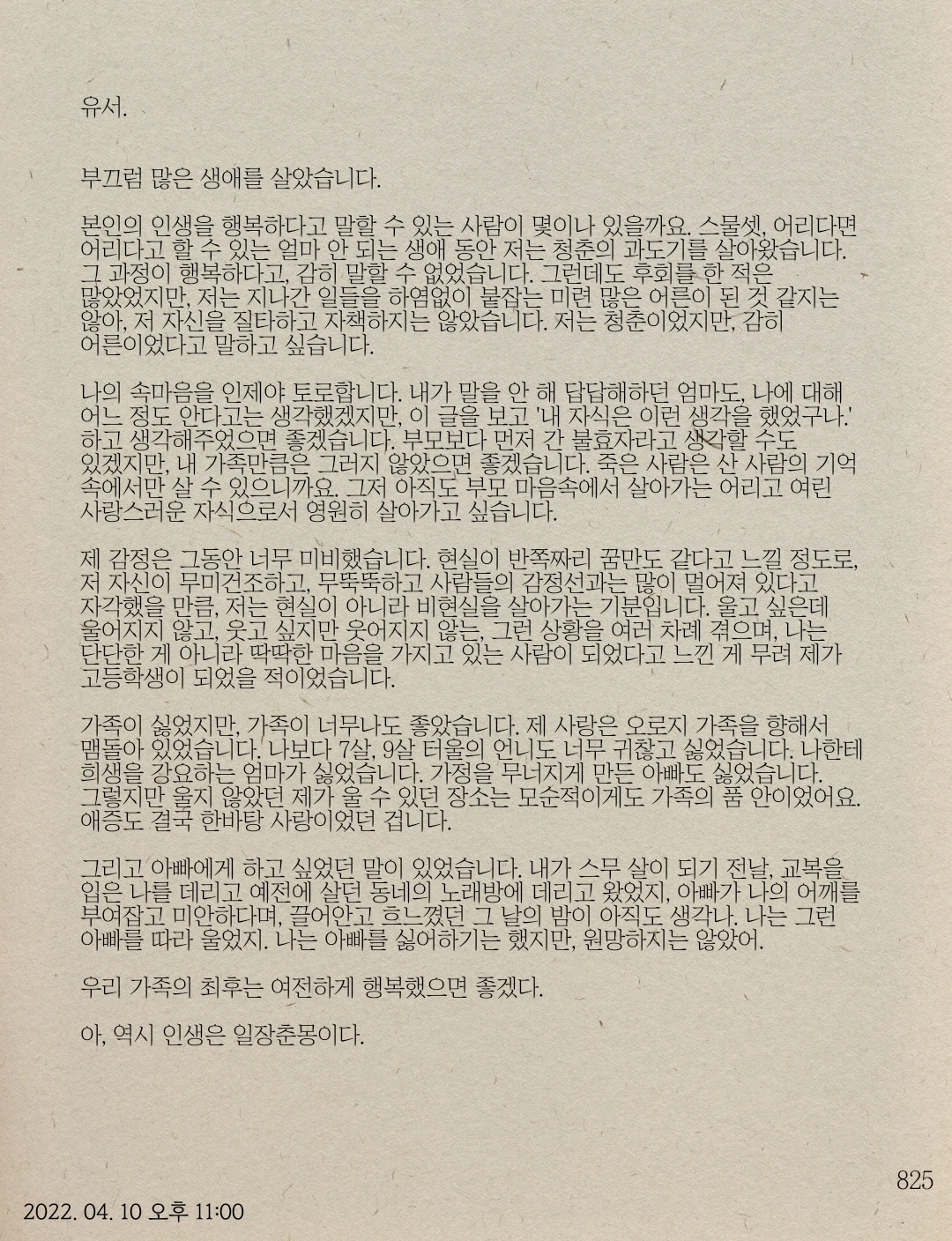 나의 속마음을 인제야 토로합니다. 내가 말을 안 해 답답해하던 엄마도, 나에 대해 어느 정도 안다고는 생각했겠지만, 이 글을 보고 '내 자식은 이런 생각을 했었구나.' 하고 생각해주었으면 좋겠습니다. 부모보다 먼저 간 불효자라고 생각할 수도 있겠지만, 내 가족만큼은 그러지 않았으면 좋겠습니다. 죽은 사람은 산 사람의 기억 속에서만 살 수 있으니까요. 그저 아직도 부모 마음속에서 살아가는 어리고 여린 사랑스러운 자식으로서 영원히 살아가고 싶습니다.