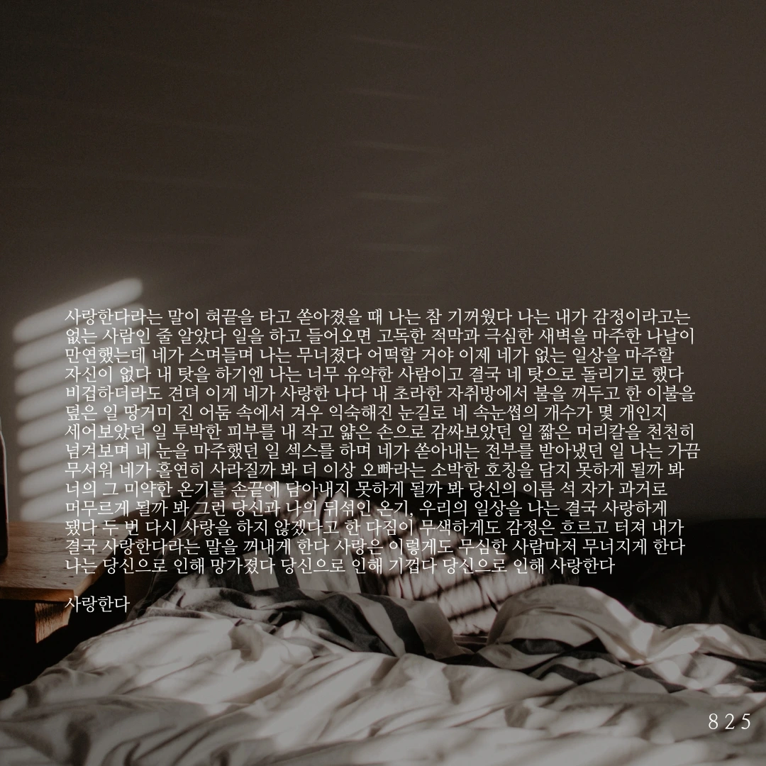사랑한다라는 말이 혀끝을 타고 쏟아졌을 때 나는 참 기꺼웠다 나는 내가 감정이라고는 없는 사람인 줄 알았다 일을 하고 들어오면 고독한 적막과 극심한 새벽을 마주한 나날이 만연했는데 네가 스며들며 나는 무너졌다 어떡할 거야 이제 네가 없는 일상을 마주할 자신이 없다 내 탓을 하기엔 나는 너무 유약한 사람이고 결국 네 탓으로 돌리기로 했다 비겁하더라도 견뎌 이게 네가 사랑한 나다 내 초라한 자취방에서 불을 꺼두고 한 이불을 덮은 일 땅거미 진 어둠 속에서 겨우 익숙해진 눈길로 네 속눈썹의 개수가 몇 개인지 세어보았던 일 투박한 피부를 내 작고 얇은 손으로 감싸보았던 일 짧은 머리칼을 천천히 넘겨보며 네 눈을 마주했던 일 섹스를 하며 네가 쏟아내는 전부를 받아냈던 일 나는 가끔 무서워 네가 홀연히 사라질까 봐 더 이상 오빠라는 소박한 호칭을 담지 못하게 될까 봐 너의 그 미약한 온기를 손끝에 담아내지 못하게 될까 봐 당신의 이름 석 자가 과거로 머무르게 될까 봐 그런 당신과 나의 뒤섞인 온기, 우리의 일상을 나는 결국 사랑하게 됐다 두 번 다시 사랑을 하지 않겠다고 한 다짐이 무색하게도 감정은 흐르고 터져 내가 결국 사랑한다라는 말을 꺼내게 한다 사랑은 이렇게도 무심한 사람마저 무너지게 한다 나는 당신으로 인해 망가졌다 당신으로 인해 기껍다 당신으로 인해 사랑한다