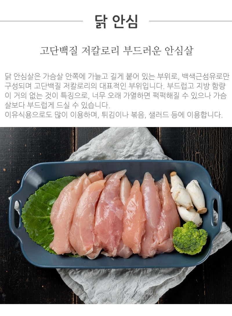닭가슴살이 운동하는 사람들의 상징적인 식사처럼 되어 있지만 사실 길쭉한 모양의 닭 안심살도 닭가슴살에 못지 않게 단백질이 풍부하고 지방이 적어 우리 몸에 좋다고 합니다. 특히 닭가슴살에 비해 식감이 조금 더 좋고 크기가 작기 때문에 조리시간의 효율도 있다고 하니 원하시는 분들께서는 활용해 보시면 좋겠습니다. 큰 차이는 없지만 닭가슴살이 질린다 싶으실 때 완벽한 대체제로 사용할 수 있으니 참고하시면 좋겠습니다.